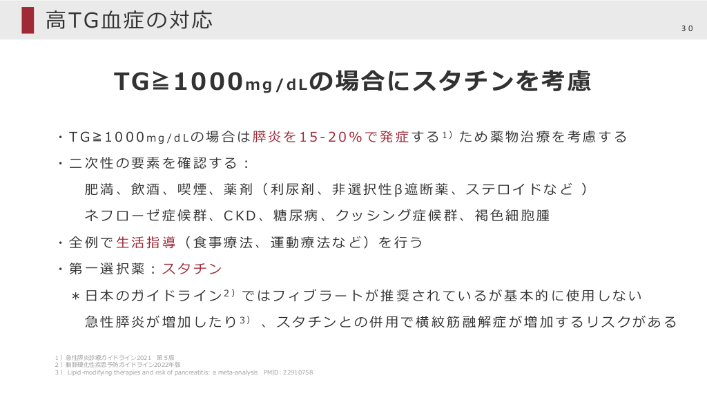 ⾼ TG ⾎ 症 の 対 応 30 TG≧1000 m g / d L の場合にスタチンを考慮 ・ T G ≧ 1 0 0 0 m g / d L の 場 合 は 膵 炎 を 1 5 - 2 0 % で 発 症 す る 1)た め 薬 物 治 療 を 考 慮 す る ・⼆次性の要素を確認する︓ 肥満、飲酒、喫煙、薬剤(利尿剤、⾮選択性β遮断薬、ステロイドなど ) ネフローゼ症候群、CKD、糖尿病、クッシング症候群、褐⾊細胞腫 ・全例で⽣活指導(⾷事療法、運動療法など)を⾏う ・第⼀選択薬︓スタチン * ⽇ 本 の ガ イ ド ラ イ ン 2)で は フ ィ ブ ラ ー ト が 推 奨 さ れ て い る が 基 本 的 に 使 ⽤ し な い 急 性 膵 炎 が 増 加 し た り 3) 、 ス タ チ ン と の 併 ⽤ で 横 紋 筋 融 解 症 が 増 加 す る リ ス ク が あ る 1)急性膵炎診療ガイドライン2021 第5版 2)動脈硬化性疾患予防ガイドライン2022年版 3) Lipid-modifying therapies and risk of pancreatitis: a meta-analysis PMID: 22910758