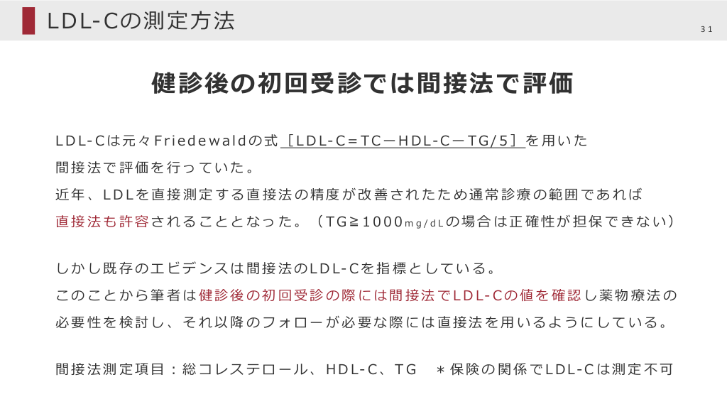 L D L- C の 測 定 ⽅ 法 31 健診後の初回受診では間接法で評価 L D L- C は 元 々 F r i e d e w a l d の 式 [ L D L- C = T C ー H D L- C ー T G / 5 ] を ⽤ い た 間接法で評価を⾏っていた。 近年、LDLを直接測定する直接法の精度が改善されたため通常診療の範囲であれば 直接法も許容されることとなった。(TG≧1000mg /dLの場合は正確性が担保できない) し か し 既 存 の エ ビ デ ン ス は 間 接 法 の L D L- C を 指 標 と し て い る 。 こ の こ と か ら 筆 者 は 健 診 後 の 初 回 受 診 の 際 に は 間 接 法 で L D L- C の 値 を 確 認 し 薬 物 療 法 の 必要性を検討し、それ以降のフォローが必要な際には直接法を⽤いるようにしている。 間 接 法 測 定 項 ⽬ ︓ 総 コ レ ス テ ロ ー ル 、 H D L- C 、 T G * 保 険 の 関 係 で L D L- C は 測 定 不 可