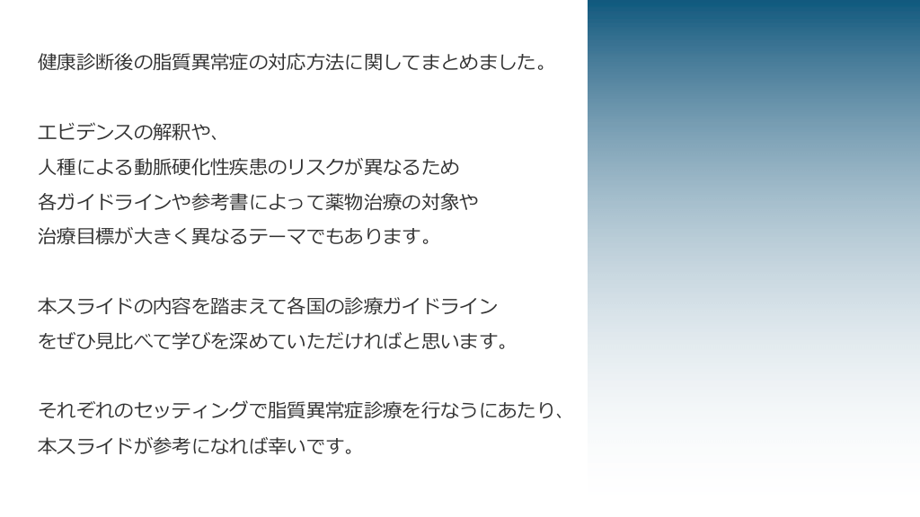 健康診断後の脂質異常症の対応⽅法に関してまとめました。 エビデンスの解釈や、 ⼈種による動脈硬化性疾患のリスクが異なるため 各ガイドラインや参考書によって薬物治療の対象や 治療⽬標が⼤きく異なるテーマでもあります。 本スライドの内容を踏まえて各国の診療ガイドライン をぜひ⾒⽐べて学びを深めていただければと思います。 それぞれのセッティングで脂質異常症診療を⾏なうにあたり、 本スライドが参考になれば幸いです。