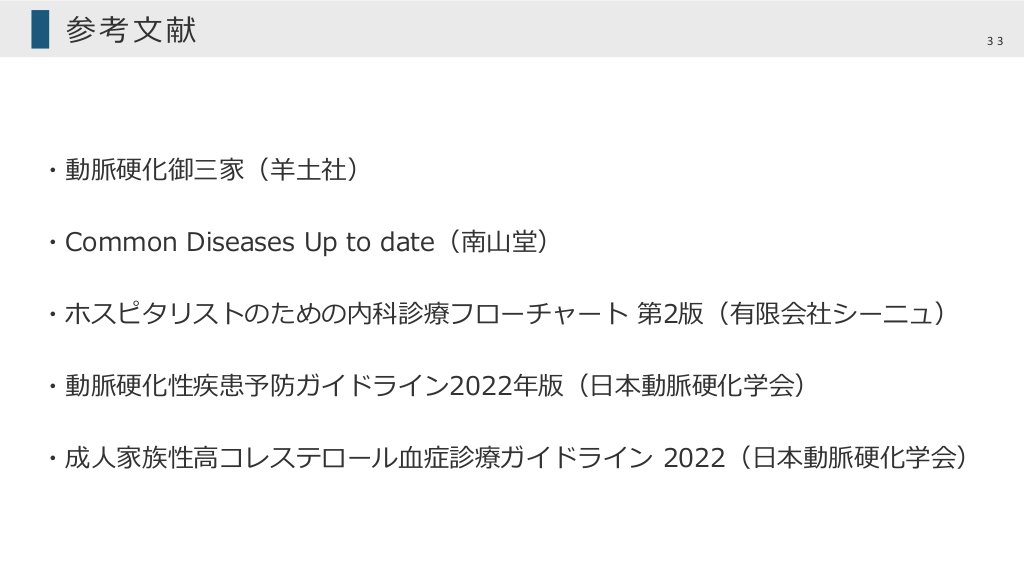 参考⽂献 ・動脈硬化御三家(⽺⼟社) ・Common Diseases Up to date(南⼭堂) ・ホスピタリストのための内科診療フローチャート 第2版(有限会社シーニュ) ・動脈硬化性疾患予防ガイドライン2022年版(⽇本動脈硬化学会) ・成⼈家族性⾼コレステロール⾎症診療ガイドライン 2022(⽇本動脈硬化学会) 33