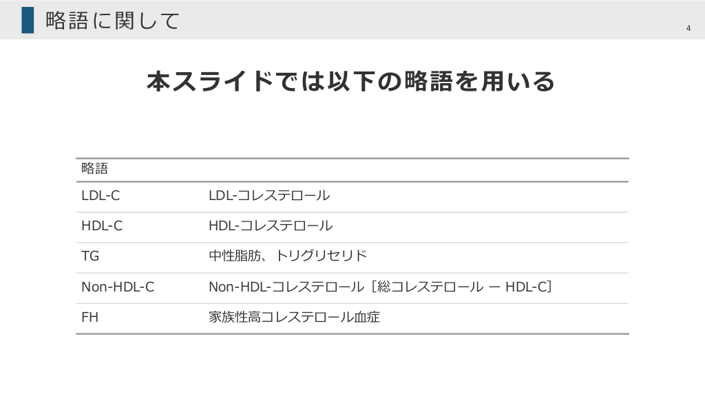 略語に関して 4 本スライドでは以下の略語を⽤いる 略語 LDL-C LDL-コレステロール HDL-C HDL-コレステロール TG 中性脂肪、トリグリセリド Non-HDL-C Non-HDL-コレステロール[総コレステロール ー HDL-C] FH 家族性⾼コレステロール⾎症