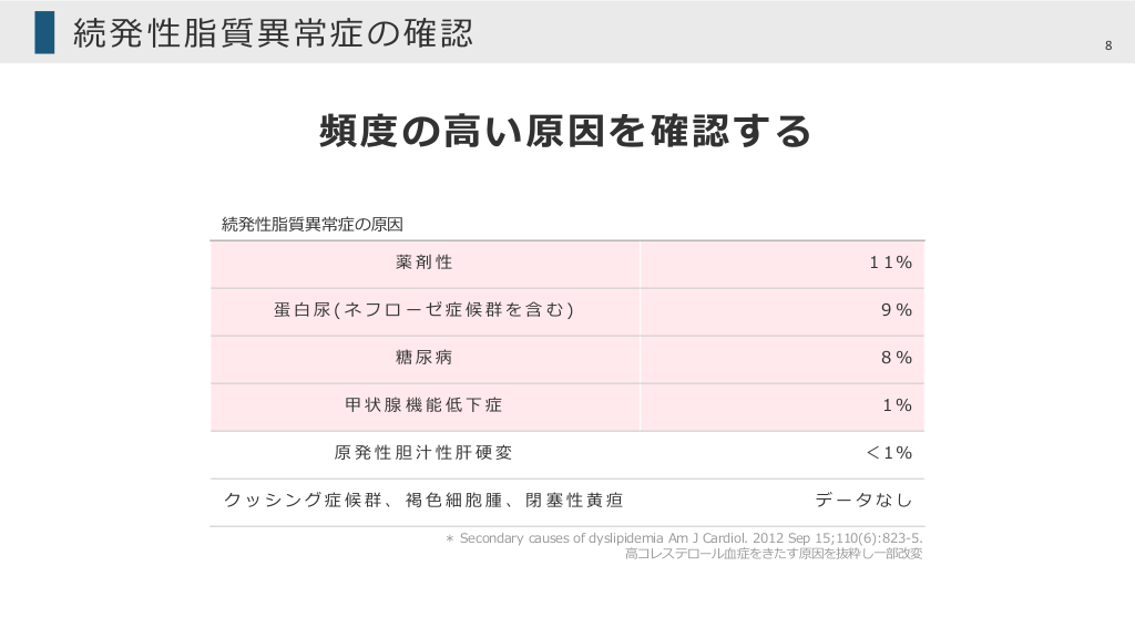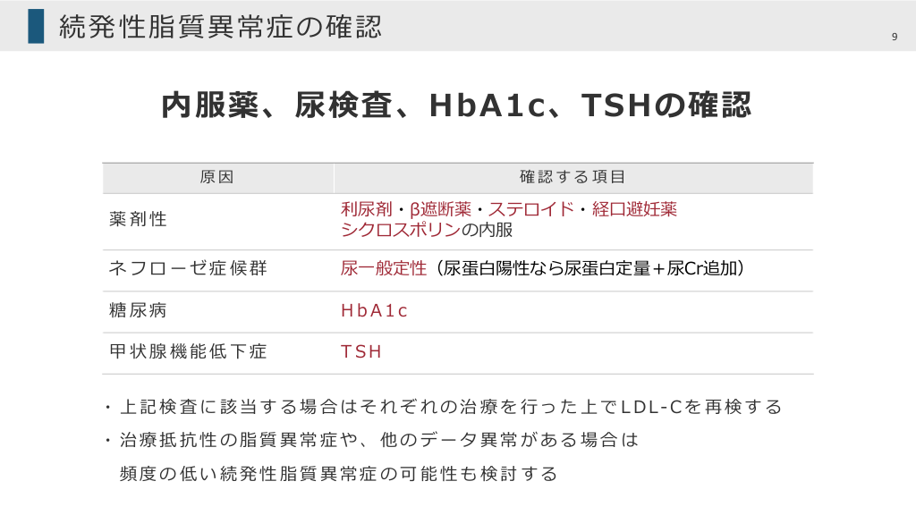 続発性脂質異常症の確認 8 頻度の⾼い原因を確認する 続発性脂質異常症の原因 薬剤性 1 1% 蛋⽩尿(ネフローゼ症候群を含む) 9% 糖尿病 8% 甲状腺機能低下症 1% 原発性胆汁性肝硬変 クッシング症候群、褐⾊細胞腫、閉塞性⻩疸 < 1% データなし * Secondary causes of dyslipidemia Am J Cardiol. 2012 Sep 15;110(6):823-5. ⾼コレステロール⾎症をきたす原因を抜粋し⼀部改変