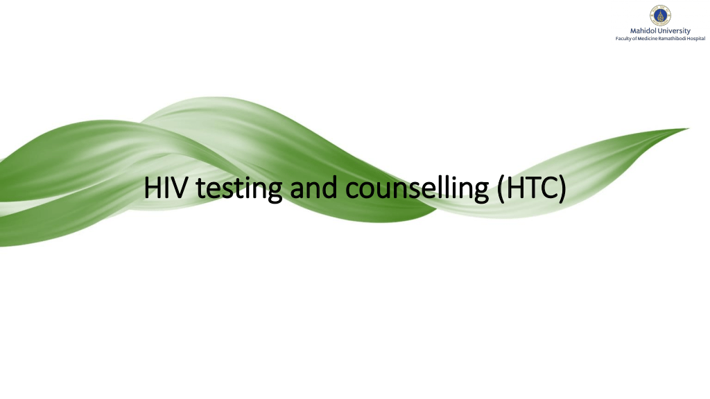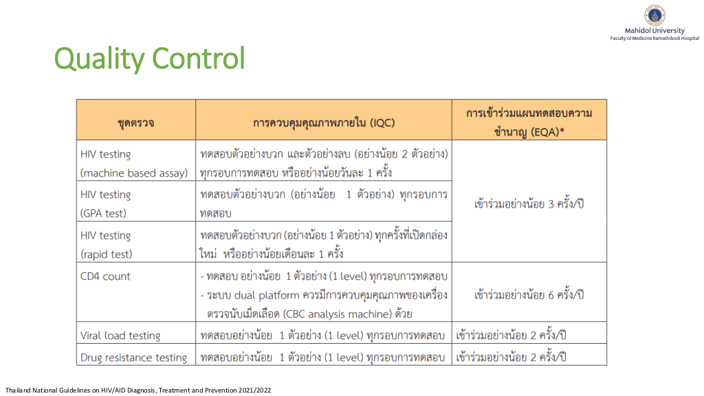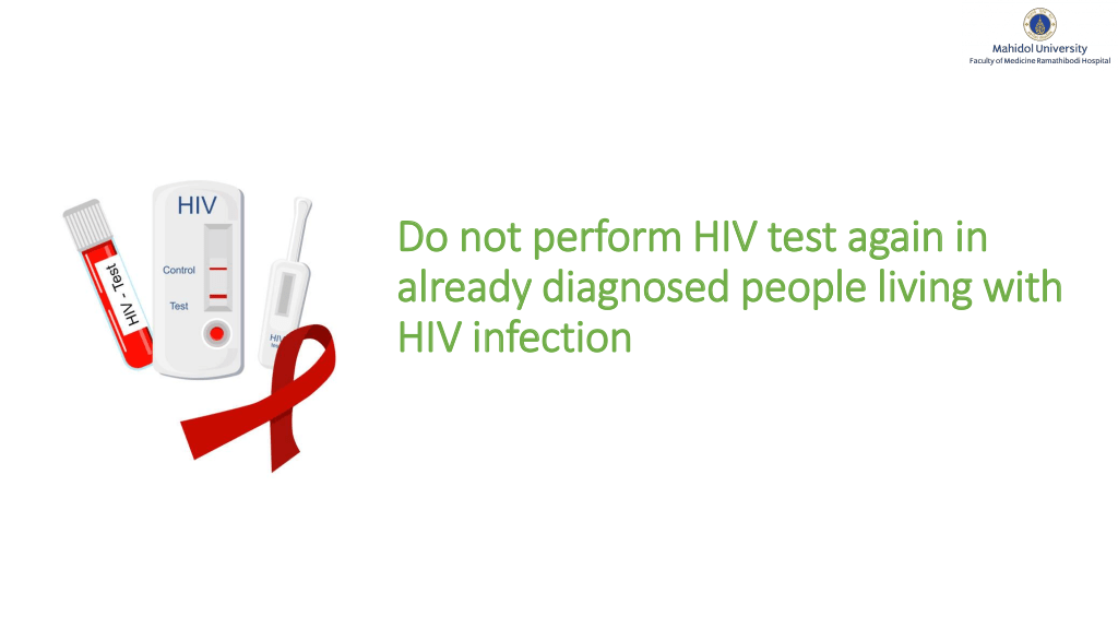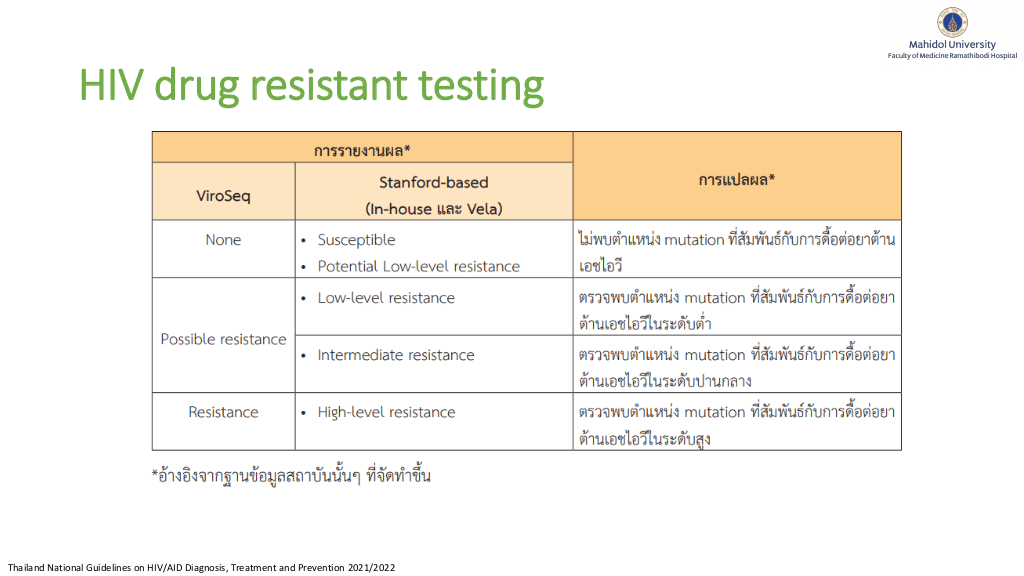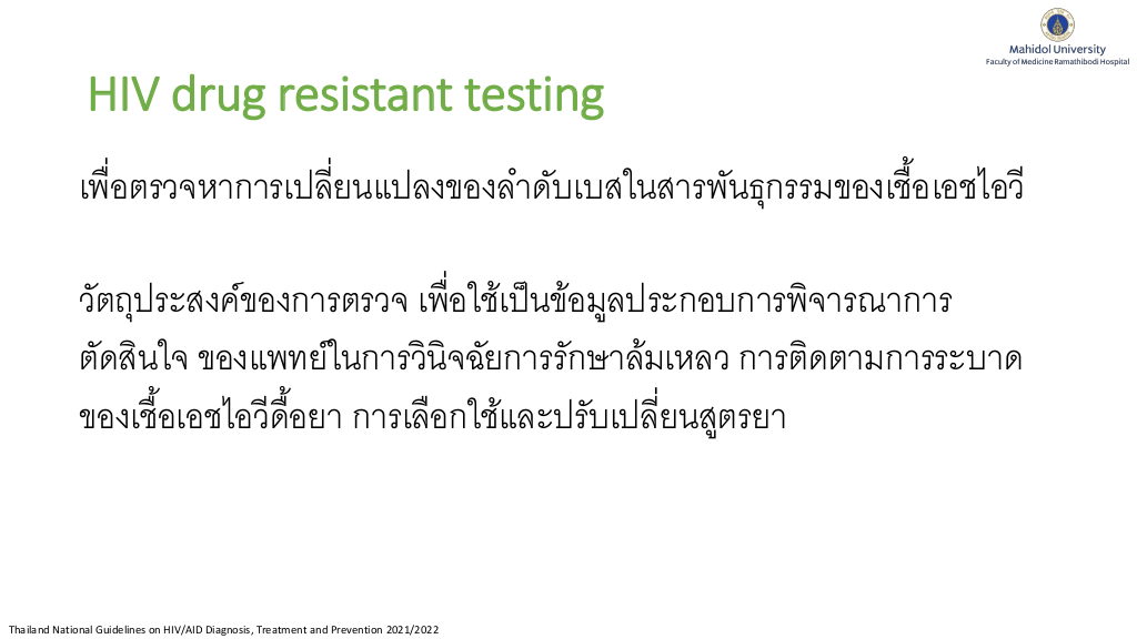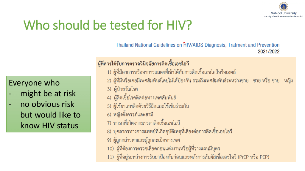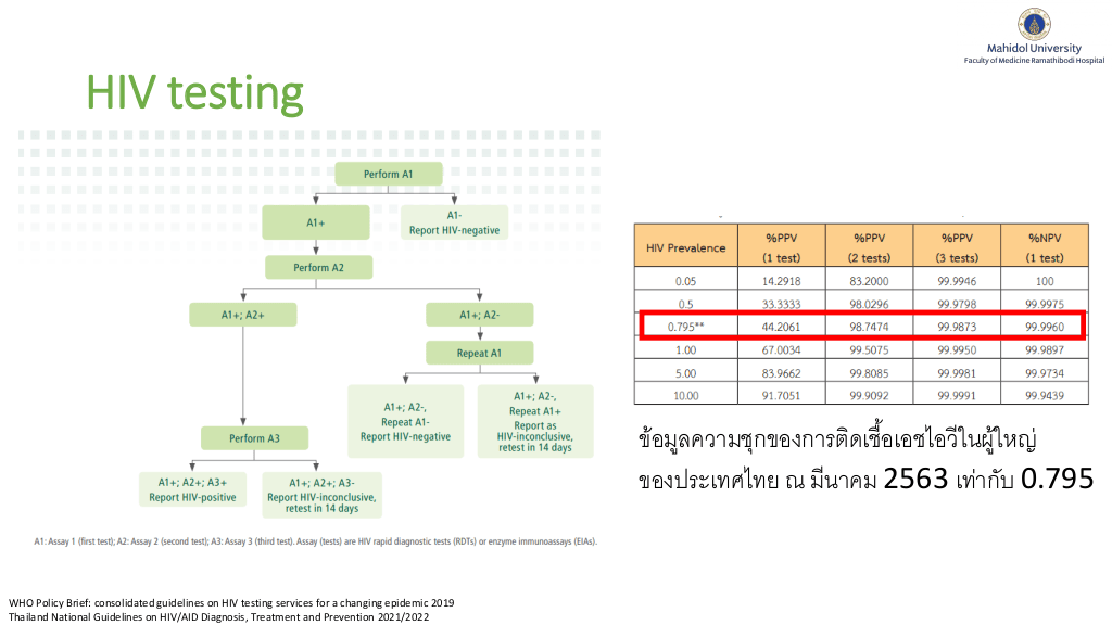 HIV testing ข้อมูลความชุกของการติดเชือ้ เอชไอวีในผูใ้ หญ่ ของประเทศไทย ณ มีนาคม 2563 เท่ากับ 0.795 WHO Policy Brief: consolidated guidelines on HIV testing services for a changing epidemic 2019 Thailand National Guidelines on HIV/AID Diagnosis, Treatment and Prevention 2021/2022