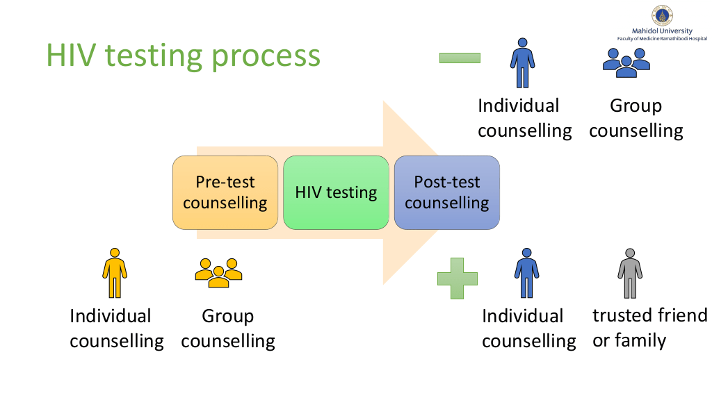 HIV testing process Individual Group counselling counselling Pre-test counselling Individual Group counselling counselling HIV testing Post-test counselling Individual trusted friend counselling or family
