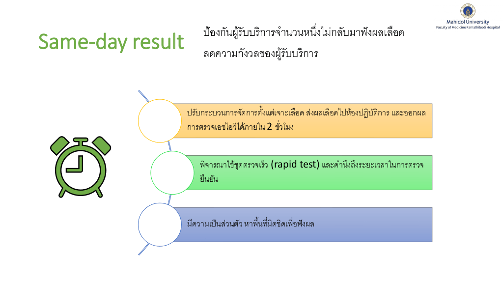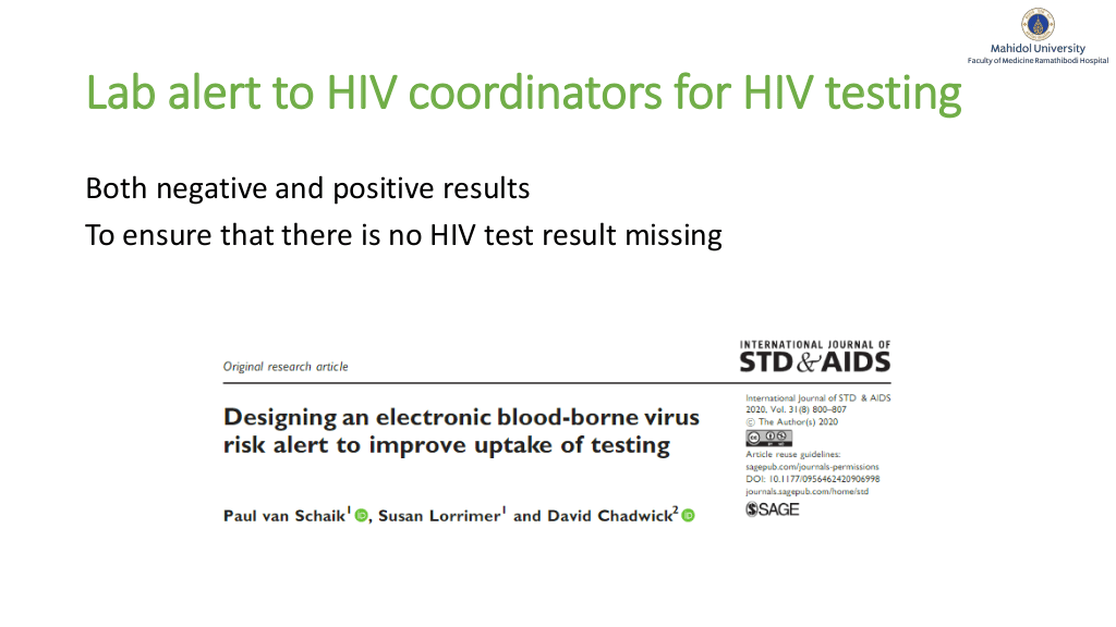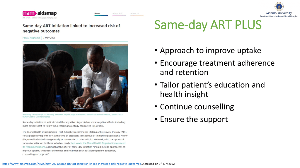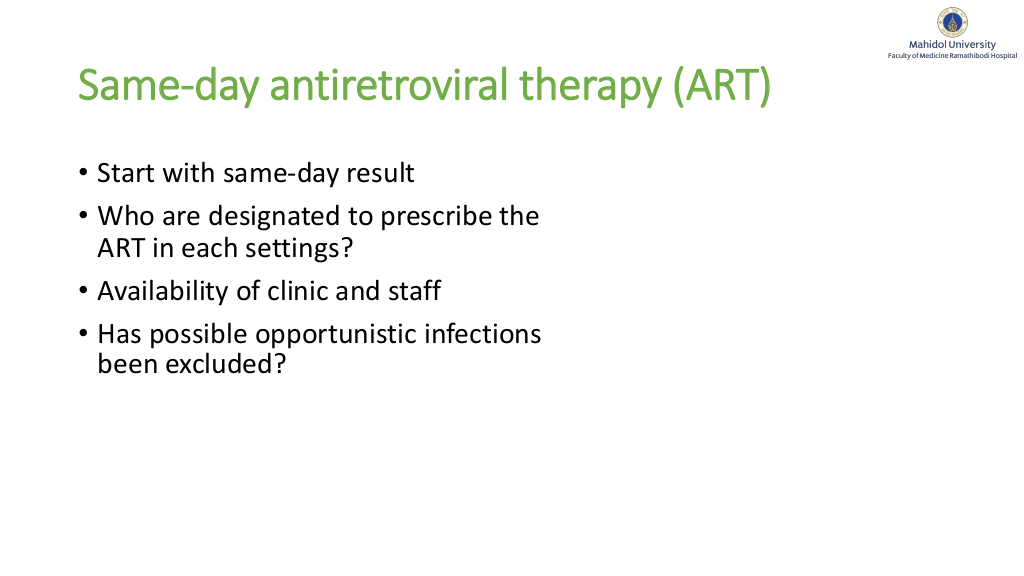 Same-day antiretroviral therapy (ART) • Start with same-day result • Who are designated to prescribe the ART in each settings? • Availability of clinic and staff • Has possible opportunistic infections been excluded?