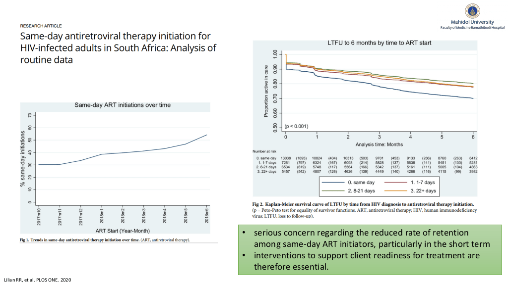 • serious concern regarding the reduced rate of retention among same-day ART initiators, particularly in the short term • interventions to support client readiness for treatment are therefore essential. Lilian RR, et al. PLOS ONE. 2020