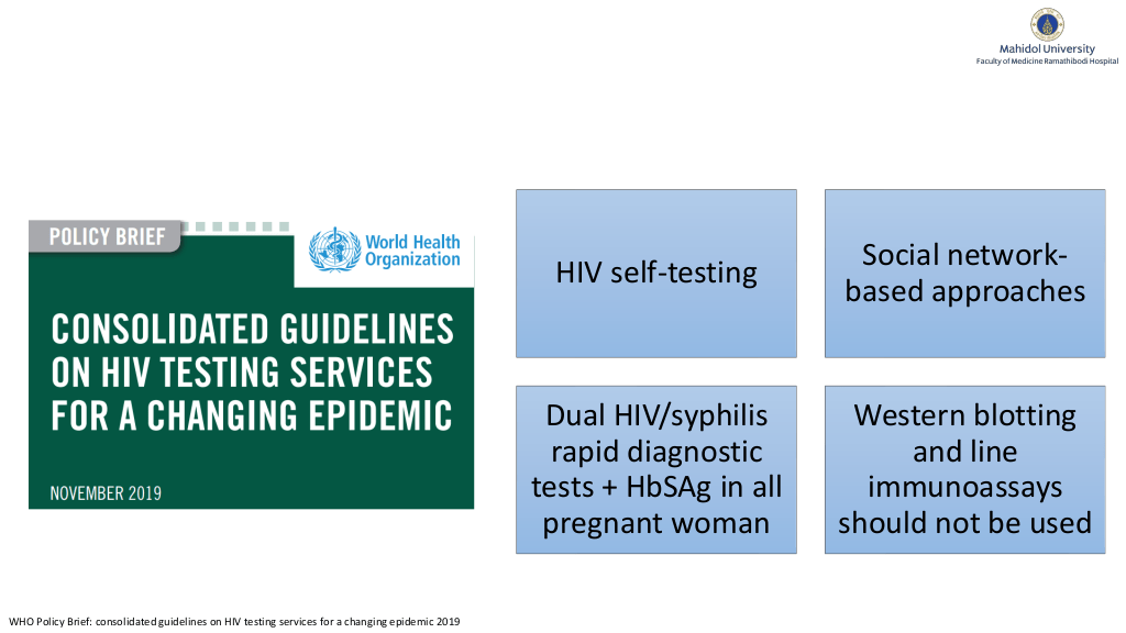 WHO Policy Brief: consolidated guidelines on HIV testing services for a changing epidemic 2019 HIV self-testing Social networkbased approaches Dual HIV/syphilis rapid diagnostic tests + HbSAg in all pregnant woman Western blotting and line immunoassays should not be used