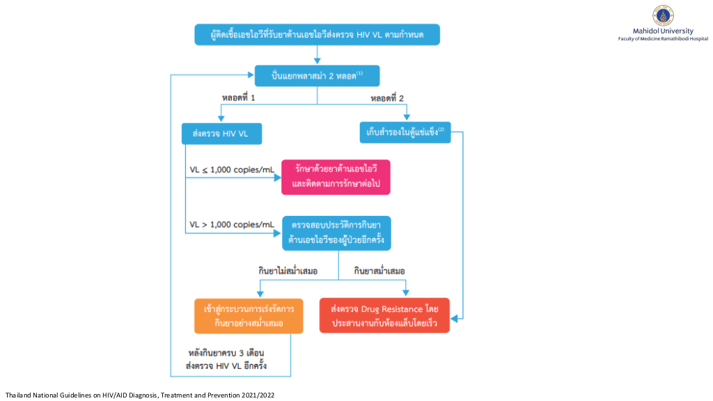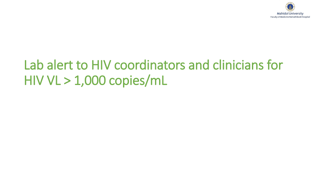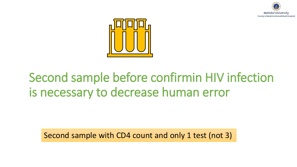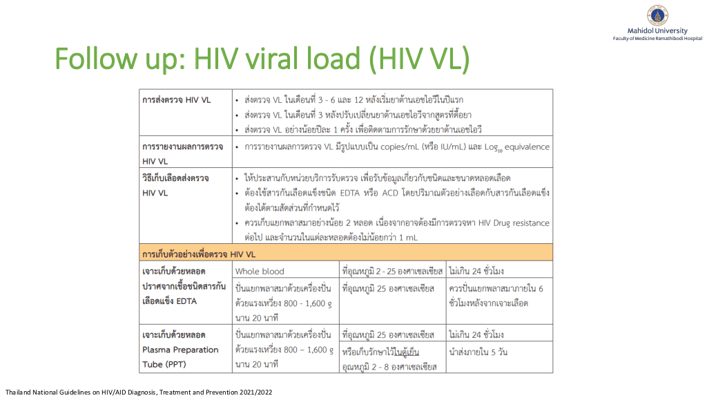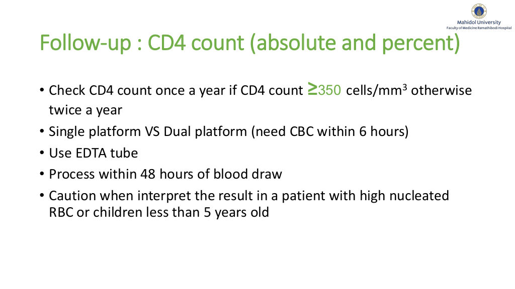 Follow-up : CD4 count (absolute and percent) • Check CD4 count once a year if CD4 count ≥350 cells/mm3 otherwise twice a year • Single platform VS Dual platform (need CBC within 6 hours) • Use EDTA tube • Process within 48 hours of blood draw • Caution when interpret the result in a patient with high nucleated RBC or children less than 5 years old