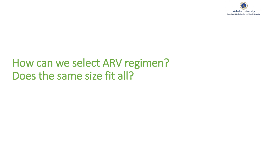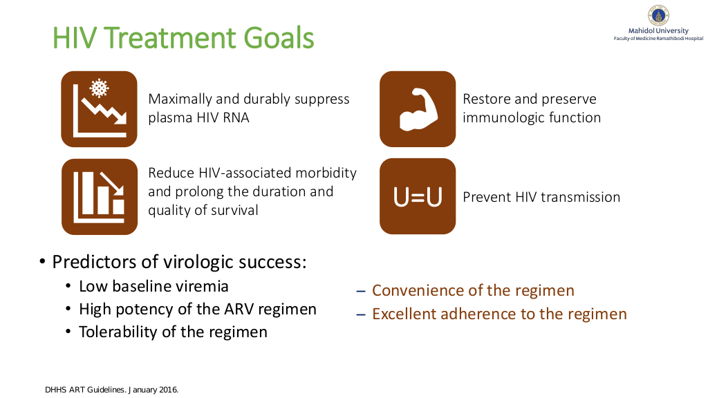 HIV Treatment Goals Restore and preserve immunologic function Maximally and durably suppress plasma HIV RNA Reduce HIV-associated morbidity and prolong the duration and quality of survival U=U Prevent HIV transmission • Predictors of virologic success: • Low baseline viremia • High potency of the ARV regimen • Tolerability of the regimen DHHS ART Guidelines. January 2016. ̶ Convenience of the regimen ̶ Excellent adherence to the regimen