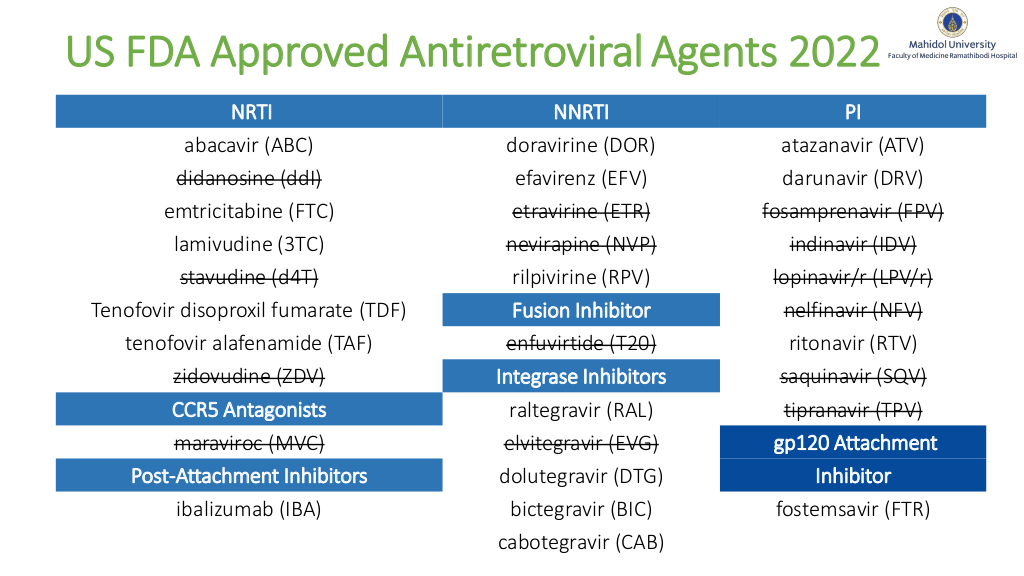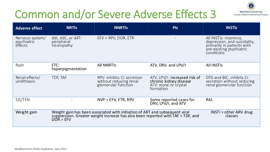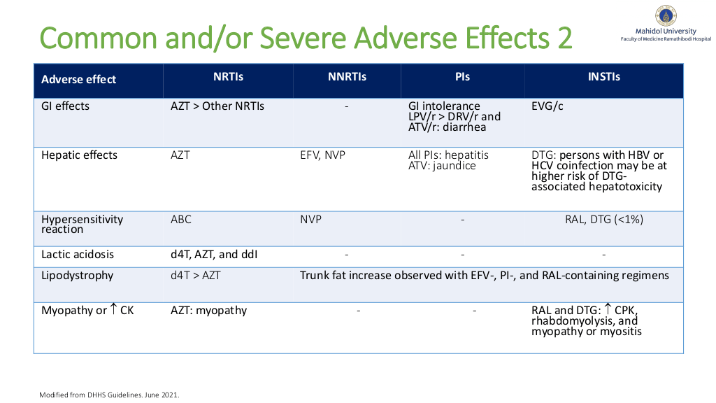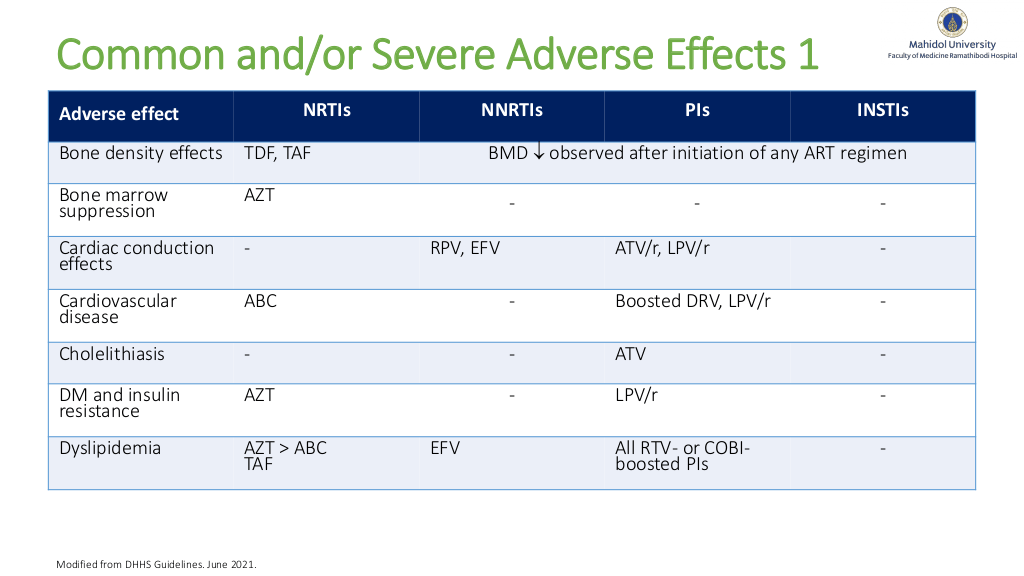 Common and/or Severe Adverse Effects 1 NRTIs Adverse effect Bone density effects TDF, TAF Bone marrow suppression AZT Cardiac conduction effects - Cardiovascular disease ABC Cholelithiasis NNRTIs PIs INSTIs BMD observed after initiation of any ART regimen - - ATV/r, LPV/r - - Boosted DRV, LPV/r - - - ATV - DM and insulin resistance AZT - LPV/r - Dyslipidemia AZT > ABC TAF All RTV- or COBIboosted PIs - Modified from DHHS Guidelines. June 2021. RPV, EFV - EFV