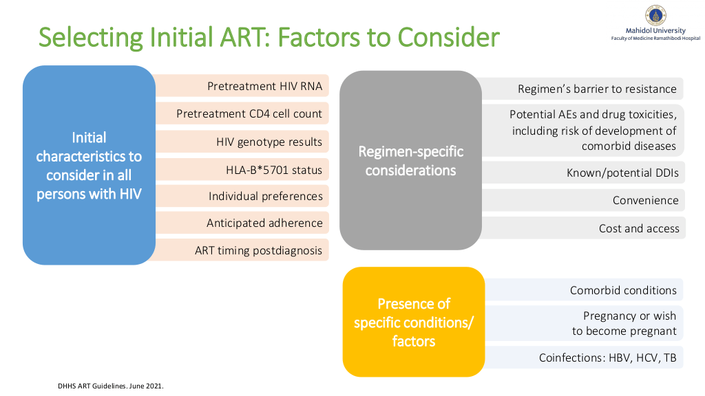 Selecting Initial ART: Factors to Consider Initial characteristics to consider in all persons with HIV Pretreatment HIV RNA Regimen’s barrier to resistance Pretreatment CD4 cell count Potential AEs and drug toxicities, including risk of development of comorbid diseases HIV genotype results HLA-B*5701 status Regimen-specific considerations Known/potential DDIs Individual preferences Convenience Anticipated adherence Cost and access ART timing postdiagnosis Presence of specific conditions/ factors Comorbid conditions Pregnancy or wish to become pregnant Coinfections: HBV, HCV, TB DHHS ART Guidelines. June 2021.