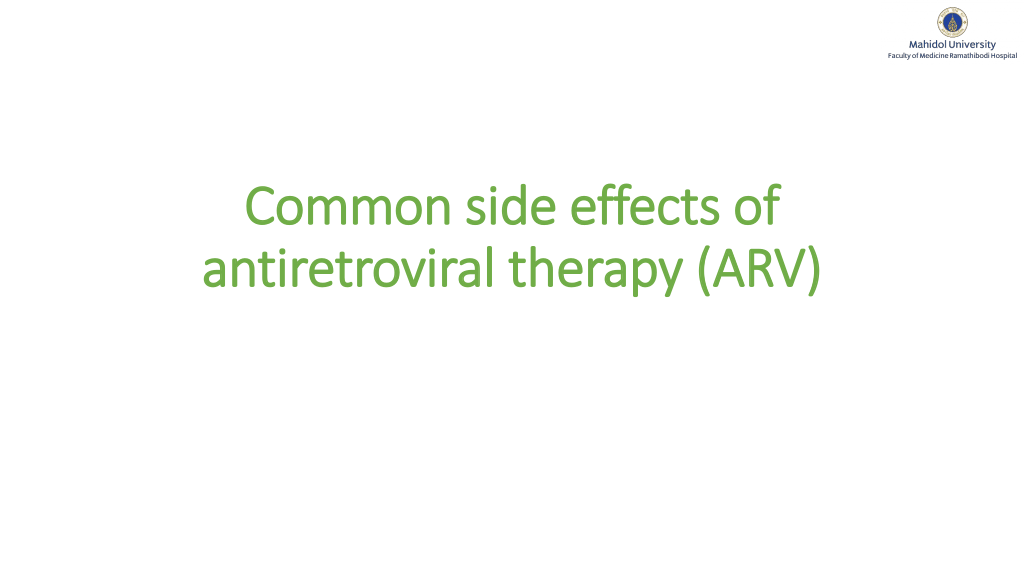 Common and/or Severe Adverse Effects 2 NRTIs Adverse effect NNRTIs GI effects AZT > Other NRTIs Hepatic effects AZT EFV, NVP Hypersensitivity reaction ABC NVP Lactic acidosis d4T, AZT, and ddI Lipodystrophy d4T > AZT Myopathy or CK AZT: myopathy Modified from DHHS Guidelines. June 2021. - - PIs INSTIs GI intolerance LPV/r > DRV/r and ATV/r: diarrhea EVG/c All PIs: hepatitis ATV: jaundice DTG: persons with HBV or HCV coinfection may be at higher risk of DTGassociated hepatotoxicity - RAL, DTG (<1%) - - Trunk fat increase observed with EFV-, PI-, and RAL-containing regimens - - RAL and DTG: CPK, rhabdomyolysis, and myopathy or myositis