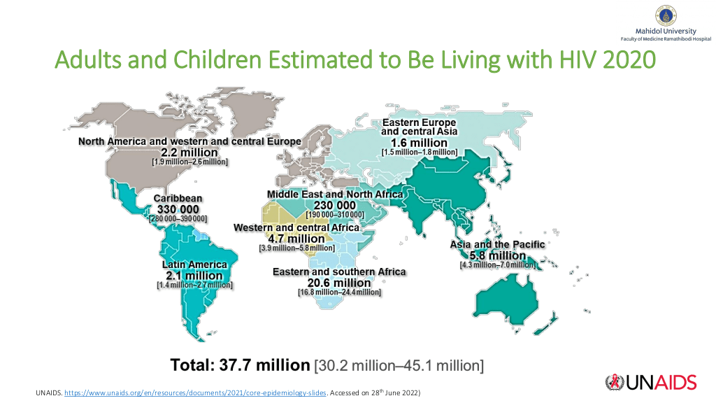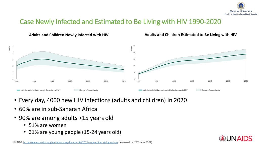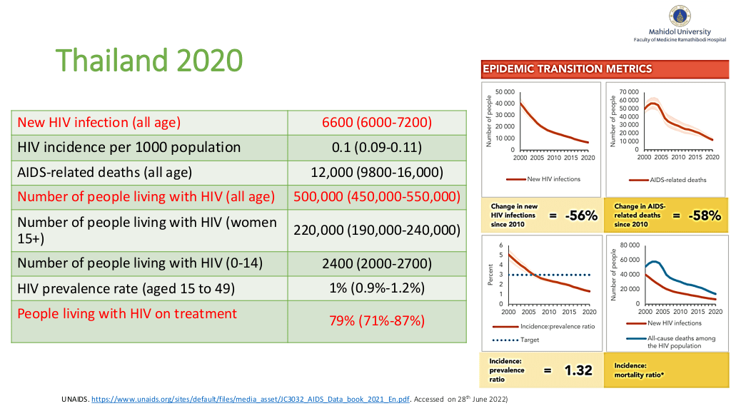 Thailand 2020 New HIV infection (all age) HIV incidence per 1000 population AIDS-related deaths (all age) 6600 (6000-7200) 0.1 (0.09-0.11) 12,000 (9800-16,000) Number of people living with HIV (all age) 500,000 (450,000-550,000) Number of people living with HIV (women 15+) 220,000 (190,000-240,000) Number of people living with HIV (0-14) HIV prevalence rate (aged 15 to 49) People living with HIV on treatment 2400 (2000-2700) 1% (0.9%-1.2%) 79% (71%-87%) UNAIDS. https://www.unaids.org/sites/default/files/media_asset/JC3032_AIDS_Data_book_2021_En.pdf. Accessed on 28th June 2022)