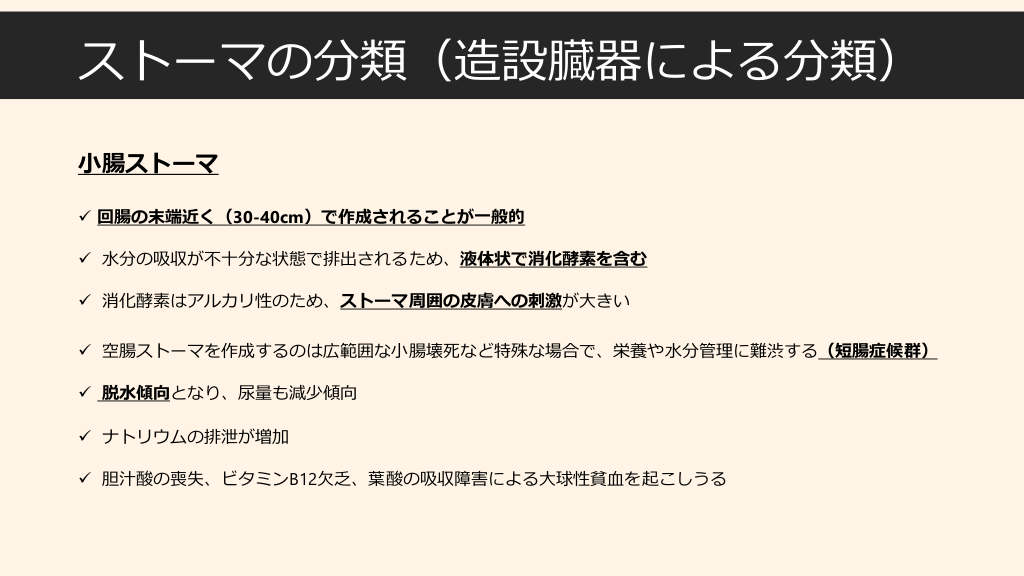#10. ストーマの分類(造設臓器による分類) 小腸ストーマ ✓ 回腸の末端近く(30-40cm)で作成されることが一般的 ✓ 水分の吸収が不十分な状態で排出されるため、液体状で消化酵素を含む  ✓ 消化酵素はアルカリ性のため、ストーマ周囲の皮膚への刺激が大きい ✓ 空腸ストーマを作成するのは広範囲な小腸壊死など特殊な場合で、栄養や水分管理に難渋する(短腸症候群)  ✓ 脱水傾向となり、尿量も減少傾向 ✓ ナトリウムの排泄が増加 ✓ 胆汁酸の喪失、ビタミンB12欠乏、葉酸の吸収障害による大球性貧血を起こしうる