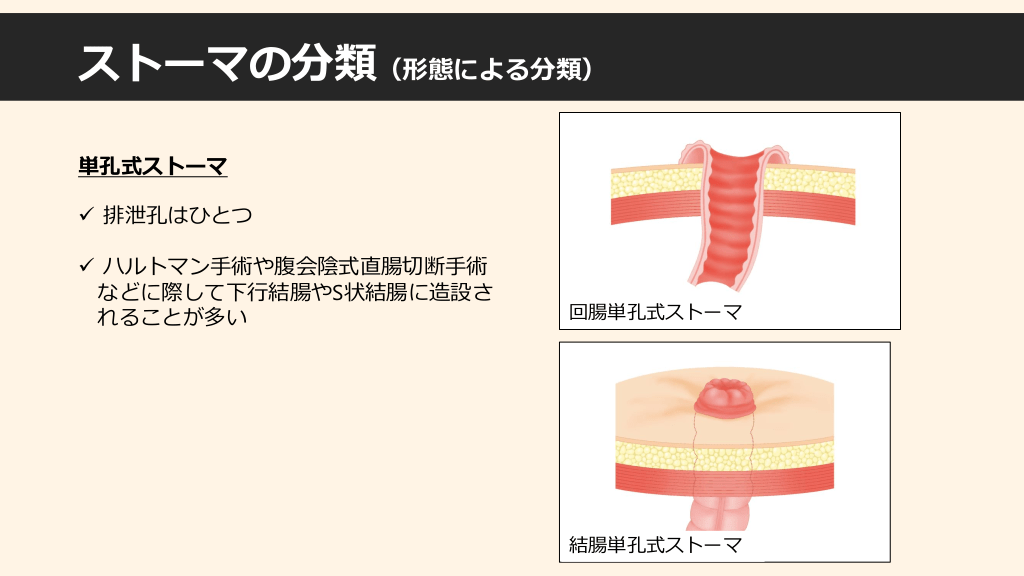 #11. ストーマの分類(形態による分類) 単孔式ストーマ ✓ 排泄孔はひとつ ✓ ハルトマン手術や腹会陰式直腸切断手術 などに際して下行結腸やS状結腸に造設さ れることが多い  回腸単孔式ストーマ  結腸単孔式ストーマ