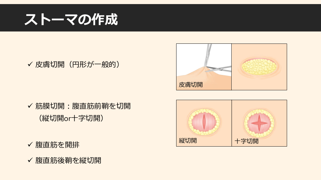 #13. ストーマの作成  ✓ 皮膚切開(円形が一般的) 皮膚切開  ✓ 筋膜切開:腹直筋前鞘を切開 (縦切開or十字切開) ✓ 腹直筋を開排  ✓ 腹直筋後鞘を縦切開  縦切開  十字切開