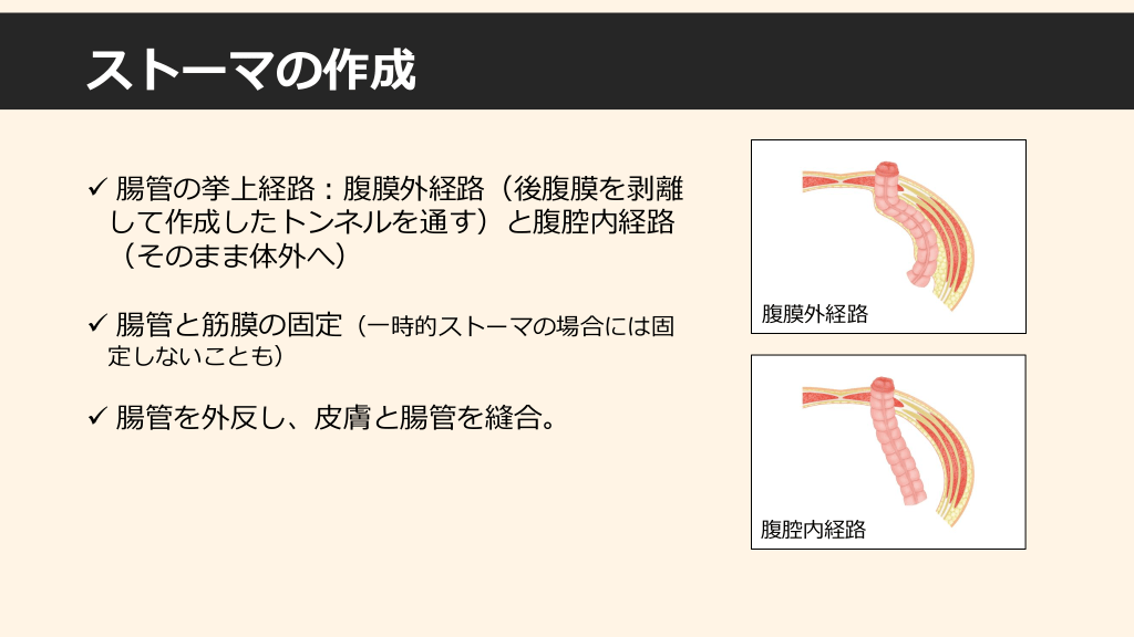 #14. ストーマの作成 ✓ 腸管の挙上経路:腹膜外経路(後腹膜を剥離 して作成したトンネルを通す)と腹腔内経路 (そのまま体外へ) ✓ 腸管と筋膜の固定(一時的ストーマの場合には固  腹膜外経路  定しないことも)  ✓ 腸管を外反し、皮膚と腸管を縫合。  腹腔内経路