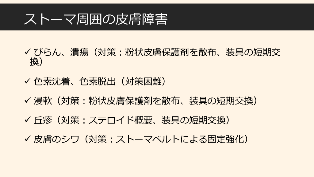 #17. ストーマ周囲の皮膚障害 ✓ びらん、潰瘍(対策:粉状皮膚保護剤を散布、装具の短期交 換) ✓ 色素沈着、色素脱出(対策困難) ✓ 浸軟(対策:粉状皮膚保護剤を散布、装具の短期交換)  ✓ 丘疹(対策:ステロイド概要、装具の短期交換) ✓ 皮膚のシワ(対策:ストーマベルトによる固定強化)