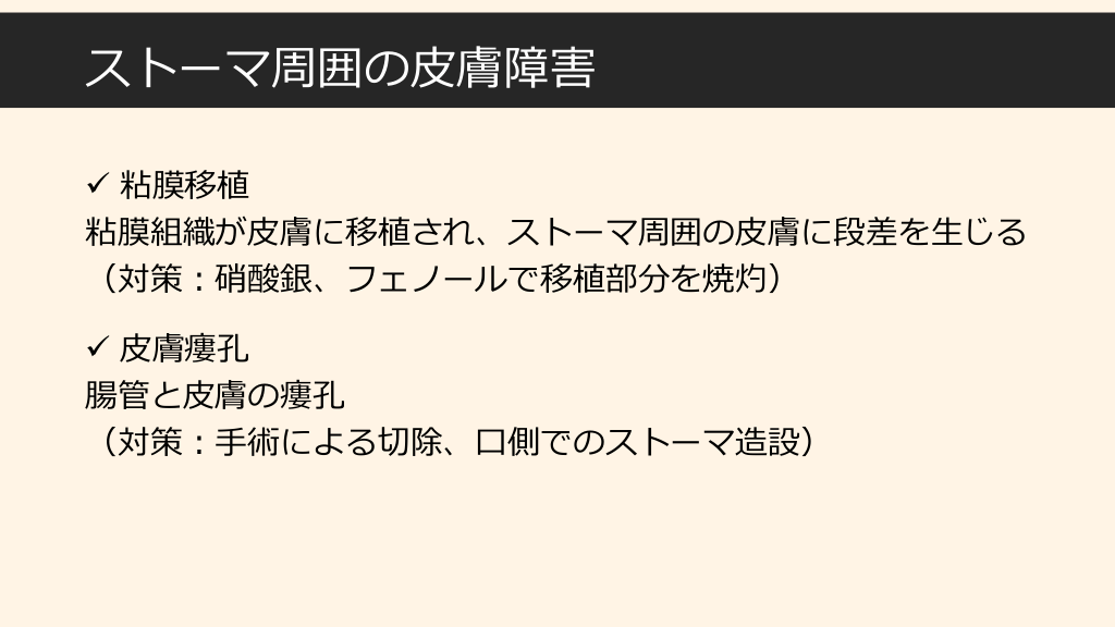 #18. ストーマ周囲の皮膚障害 ✓ 粘膜移植 粘膜組織が皮膚に移植され、ストーマ周囲の皮膚に段差を生じる (対策:硝酸銀、フェノールで移植部分を焼灼) ✓ 皮膚瘻孔 腸管と皮膚の瘻孔 (対策:手術による切除、口側でのストーマ造設)