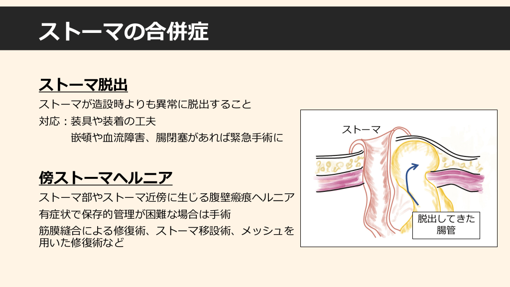 #19. ストーマの合併症 ストーマ脱出 ストーマが造設時よりも異常に脱出すること 対応:装具や装着の工夫 嵌頓や血流障害、腸閉塞があれば緊急手術に  ストーマ  傍ストーマヘルニア ストーマ部やストーマ近傍に生じる腹壁瘢痕ヘルニア 有症状で保存的管理が困難な場合は手術 筋膜縫合による修復術、ストーマ移設術、メッシュを 用いた修復術など  脱出してきた 腸管