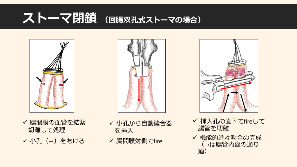 #21. ストーマ閉鎖  (回腸双孔式ストーマの場合)  ✓ 腸間膜の血管を結紮 切離して処理  ✓ 小孔から自動縫合器 を挿入  ✓ 小孔(→)をあける  ✓ 腸間膜対側でfire  ✓ 挿入孔の直下でfireして 腸管を切離  ✓ 機能的端々吻合の完成 (→は腸管内容の通り 道)