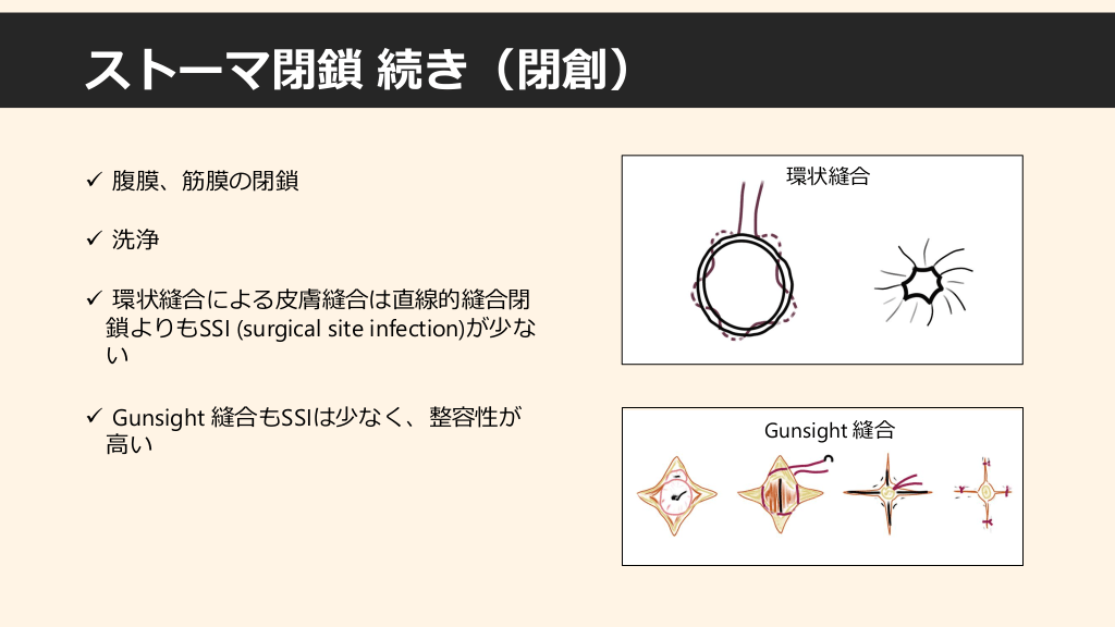 #23. ストーマ閉鎖 続き(閉創) ✓ 腹膜、筋膜の閉鎖  環状縫合  ✓ 洗浄 ✓ 環状縫合による皮膚縫合は直線的縫合閉 鎖よりもSSI (surgical site infection)が少な い ✓ Gunsight 縫合もSSIは少なく、整容性が 高い  Gunsight 縫合
