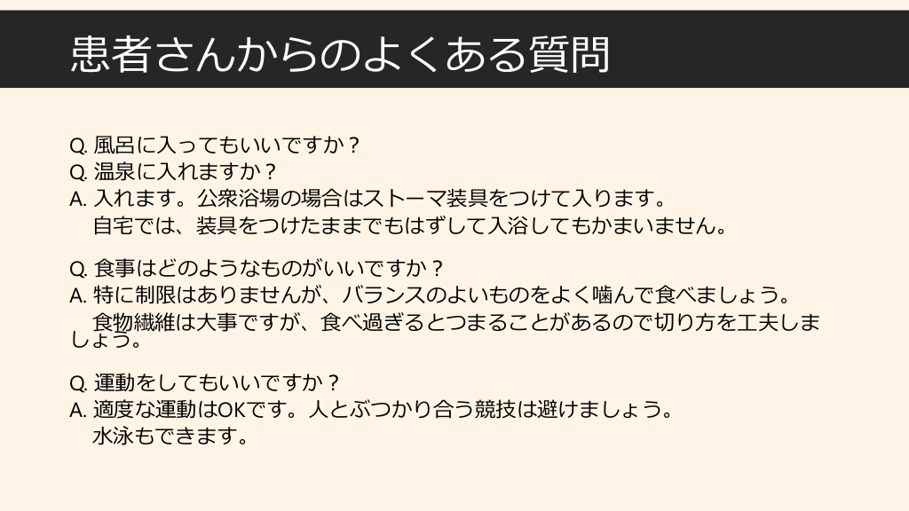 #24. 患者さんからのよくある質問 Q. 風呂に入ってもいいですか? Q. 温泉に入れますか? A. 入れます。公衆浴場の場合はストーマ装具をつけて入ります。 自宅では、装具をつけたままでもはずして入浴してもかまいません。 Q. 食事はどのようなものがいいですか? A. 特に制限はありませんが、バランスのよいものをよく噛んで食べましょう。 食物繊維は大事ですが、食べ過ぎるとつまることがあるので切り方を工夫しま しょう。 Q. 運動をしてもいいですか? A. 適度な運動はOKです。人とぶつかり合う競技は避けましょう。 水泳もできます。