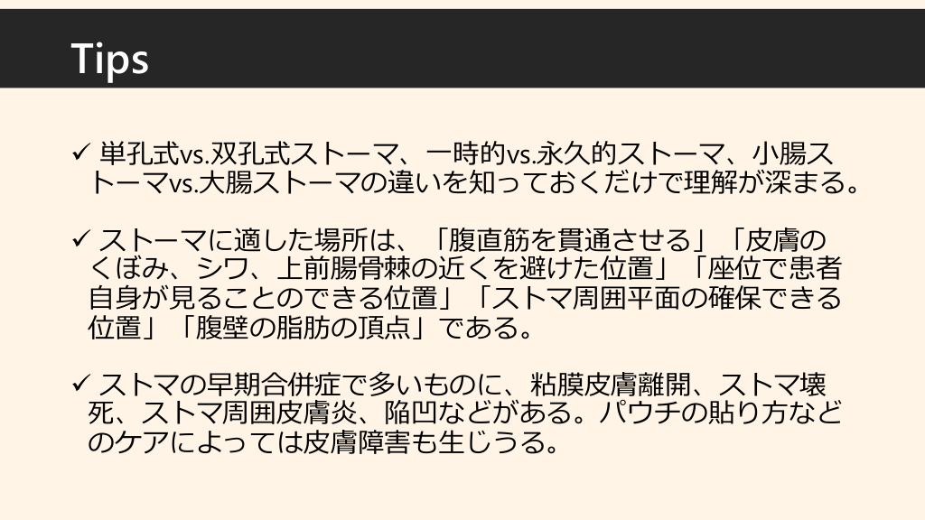 #25. Tips ✓ 単孔式vs.双孔式ストーマ、一時的vs.永久的ストーマ、小腸ス トーマvs.大腸ストーマの違いを知っておくだけで理解が深まる。 ✓ ストーマに適した場所は、「腹直筋を貫通させる」「皮膚の くぼみ、シワ、上前腸骨棘の近くを避けた位置」「座位で患者 自身が見ることのできる位置」「ストマ周囲平面の確保できる 位置」「腹壁の脂肪の頂点」である。 ✓ ストマの早期合併症で多いものに、粘膜皮膚離開、ストマ壊 死、ストマ周囲皮膚炎、陥凹などがある。パウチの貼り方など のケアによっては皮膚障害も生じうる。