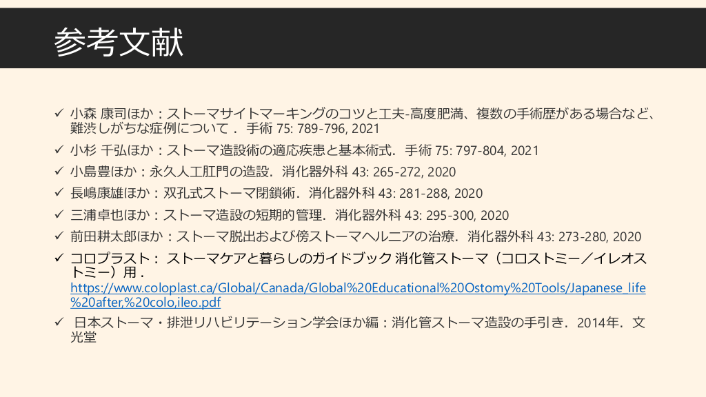 #26. 参考文献 ✓ 小森 康司ほか:ストーマサイトマーキングのコツと工夫-高度肥満、複数の手術歴がある場合など、 難渋しがちな症例について .手術 75: 789-796, 2021 ✓ 小杉 千弘ほか:ストーマ造設術の適応疾患と基本術式.手術 75: 797-804, 2021 ✓ 小島豊ほか:永久人工肛門の造設.消化器外科 43: 265-272, 2020 ✓ 長嶋康雄ほか:双孔式ストーマ閉鎖術.消化器外科 43: 281-288, 2020 ✓ 三浦卓也ほか:ストーマ造設の短期的管理.消化器外科 43: 295-300, 2020 ✓ 前田耕太郎ほか:ストーマ脱出および傍ストーマヘルニアの治療.消化器外科 43: 273-280, 2020 ✓ コロプラスト: ストーマケアと暮らしのガイドブック 消化管ストーマ(コロストミー/イレオス トミー)用 . https://www.coloplast.ca/Global/Canada/Global%20Educational%20Ostomy%20Tools/Japanese_life %20after,%20colo,ileo.pdf ✓ 日本ストーマ・排泄リハビリテーション学会ほか編:消化管ストーマ造設の手引き.2014年.文 光堂