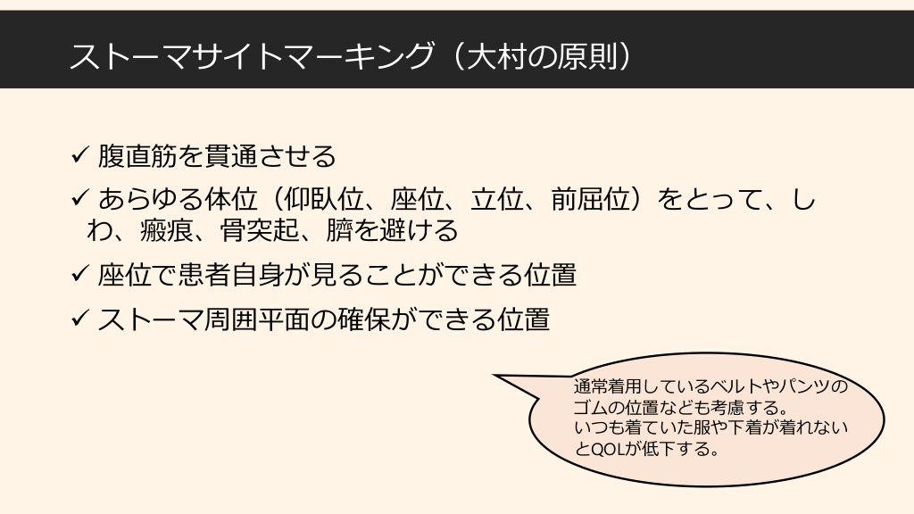 #4. ストーマサイトマーキング(大村の原則) ✓ 腹直筋を貫通させる ✓ あらゆる体位(仰臥位、座位、立位、前屈位)をとって、し わ、瘢痕、骨突起、臍を避ける ✓ 座位で患者自身が見ることができる位置 ✓ ストーマ周囲平面の確保ができる位置 通常着用しているベルトやパンツの ゴムの位置なども考慮する。 いつも着ていた服や下着が着れない とQOLが低下する。