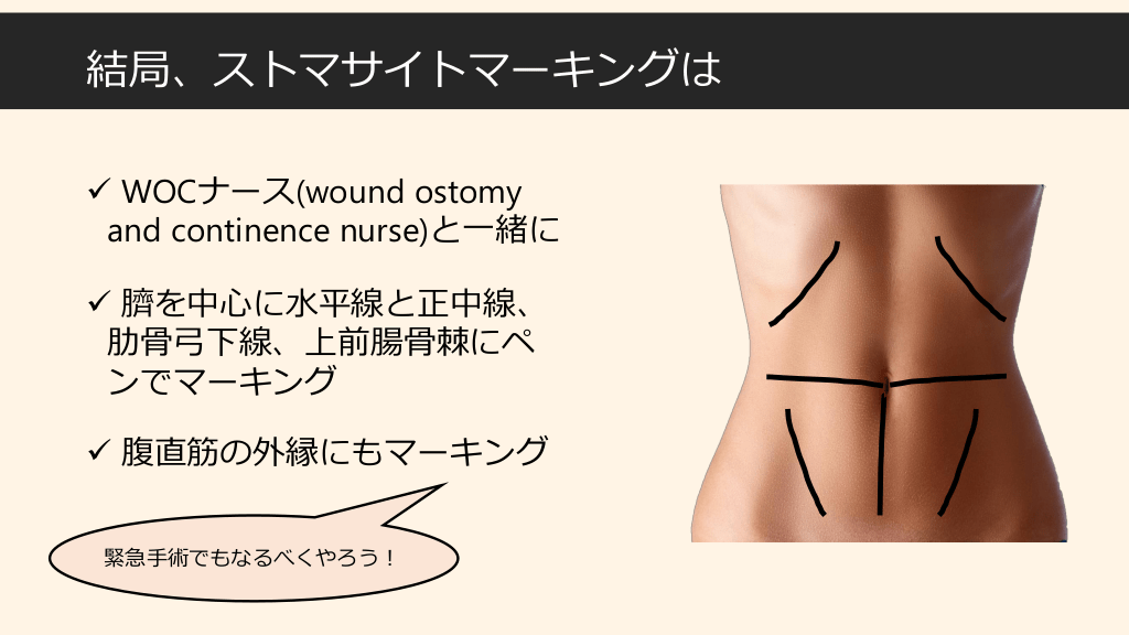 #5. 結局、ストマサイトマーキングは ✓ WOCナース(wound ostomy and continence nurse)と一緒に ✓ 臍を中心に水平線と正中線、 肋骨弓下線、上前腸骨棘にペ ンでマーキング ✓ 腹直筋の外縁にもマーキング 緊急手術でもなるべくやろう!