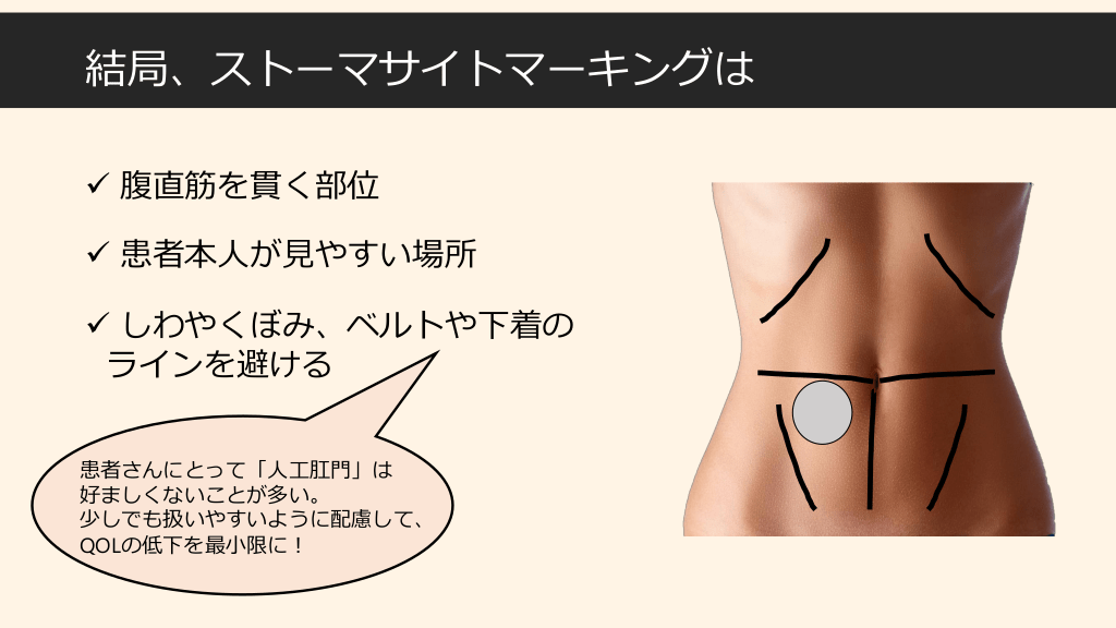 #6. 結局、ストーマサイトマーキングは ✓ 腹直筋を貫く部位 ✓ 患者本人が見やすい場所  ✓ しわやくぼみ、ベルトや下着の ラインを避ける 患者さんにとって「人工肛門」は 好ましくないことが多い。 少しでも扱いやすいように配慮して、 QOLの低下を最小限に!