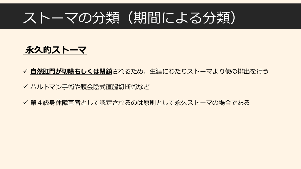 #7. ストーマの分類(期間による分類) 永久的ストーマ ✓ 自然肛門が切除もしくは閉鎖されるため、生涯にわたりストーマより便の排出を行う  ✓ ハルトマン手術や腹会陰式直腸切断術など ✓ 第4級身体障害者として認定されるのは原則として永久ストーマの場合である