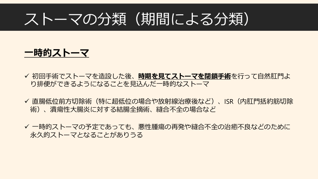 #8. ストーマの分類(期間による分類) 一時的ストーマ ✓ 初回手術でストーマを造設した後、時期を見てストーマを閉鎖手術を行って自然肛門よ り排便ができるようになることを見込んだ一時的なストーマ ✓ 直腸低位前方切除術(特に超低位の場合や放射線治療後など)、ISR(内肛門括約筋切除 術)、潰瘍性大腸炎に対する結腸全摘術、縫合不全の場合など  ✓ 一時的ストーマの予定であっても、悪性腫瘍の再発や縫合不全の治癒不良などのために 永久的ストーマとなることがありうる