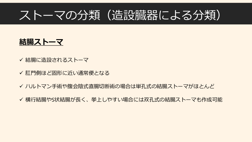 #9. ストーマの分類(造設臓器による分類) 結腸ストーマ ✓ 結腸に造設されるストーマ  ✓ 肛門側ほど固形に近い通常便となる ✓ ハルトマン手術や腹会陰式直腸切断術の場合は単孔式の結腸ストーマがほとんど  ✓ 横行結腸やS状結腸が長く、挙上しやすい場合には双孔式の結腸ストーマも作成可能