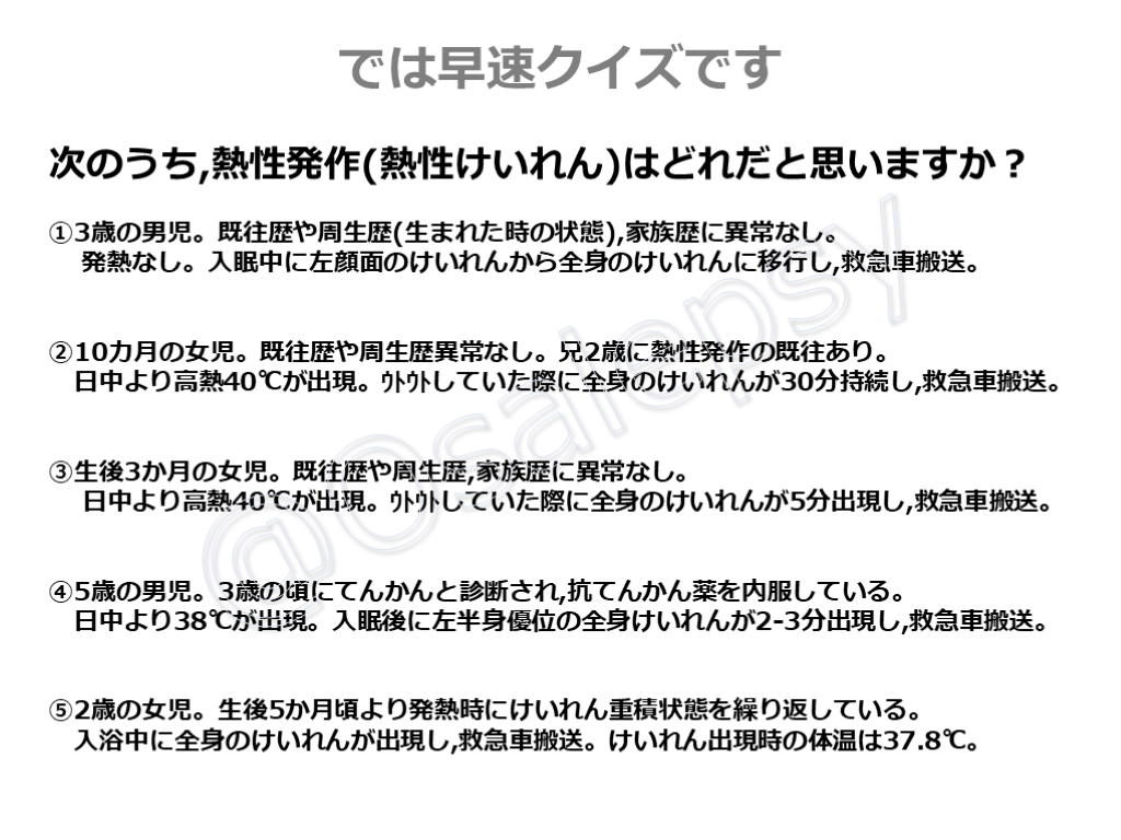 入浴中に全身のけいれんが出現し,救急車搬送。けいれん出現時の体温は37.8℃。 @Osalepsy では早速クイズです #8.