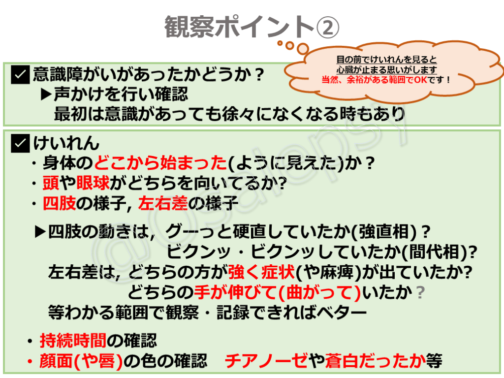・けいれん(発作)時の対処法, 観察ポイント, 救急要請等