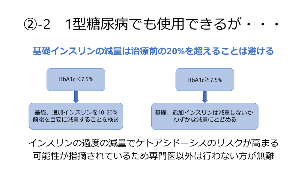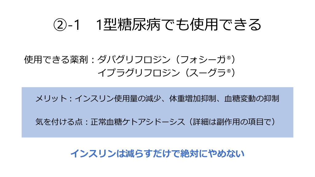 ②-1 1型糖尿病でも使用できる 使用できる薬剤:ダパグリフロジン(フォシーガ®︎) イプラグリフロジン(スーグラ®︎) メリット:インスリン使用量の減少、体重増加抑制、血糖変動の抑制 気を付ける点:正常血糖ケトアシドーシス(詳細は副作用の項目で) インスリンは減らすだけで絶対にやめない #10.