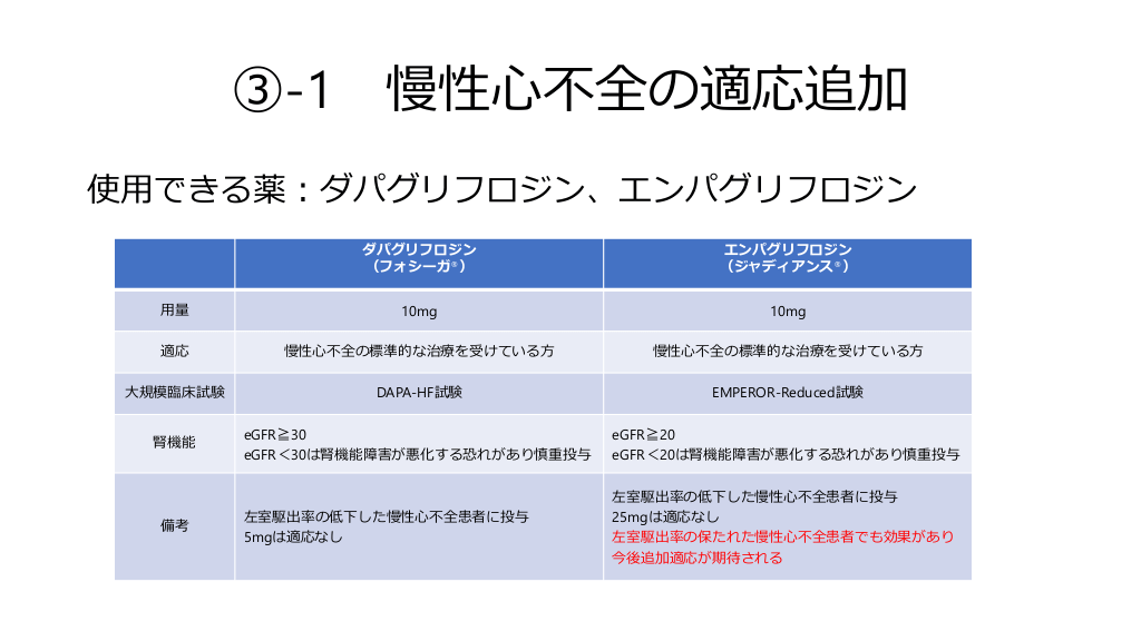 ③-1 慢性心不全の適応追加 使用できる薬:ダパグリフロジン、エンパグリフロジン ダパグリフロジン (フォシーガ®) エンパグリフロジン (ジャディアンス®) 用量 10mg 10mg 適応 慢性心不全の標準的な治療を受けている方 慢性心不全の標準的な治療を受けている方 大規模臨床試験 DAPA-HF試験 EMPEROR-Reduced試験 腎機能 eGFR≧30 eGFR<30は腎機能障害が悪化する恐れがあり慎重投与 eGFR≧20 eGFR<20は腎機能障害が悪化する恐れがあり慎重投与 左室駆出率の低下した慢性心不全患者に投与 5mgは適応なし 左室駆出率の低下した慢性心不全患者に投与 25mgは適応なし 左室駆出率の保たれた慢性心不全患者でも効果があり 今後追加適応が期待される 備考 #12.