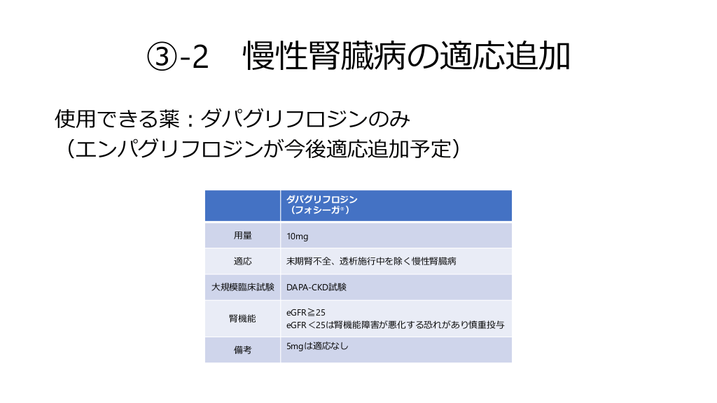 ③-2 慢性腎臓病の適応追加 使用できる薬:ダパグリフロジンのみ (エンパグリフロジンが今後適応追加予定) ダパグリフロジン (フォシーガ®) 用量 10mg 適応 末期腎不全、透析施行中を除く慢性腎臓病 大規模臨床試験 腎機能 備考 DAPA-CKD試験 eGFR≧25 eGFR<25は腎機能障害が悪化する恐れがあり慎重投与 5mgは適応なし SGLT2阻害薬の副作用と注意点 #13.