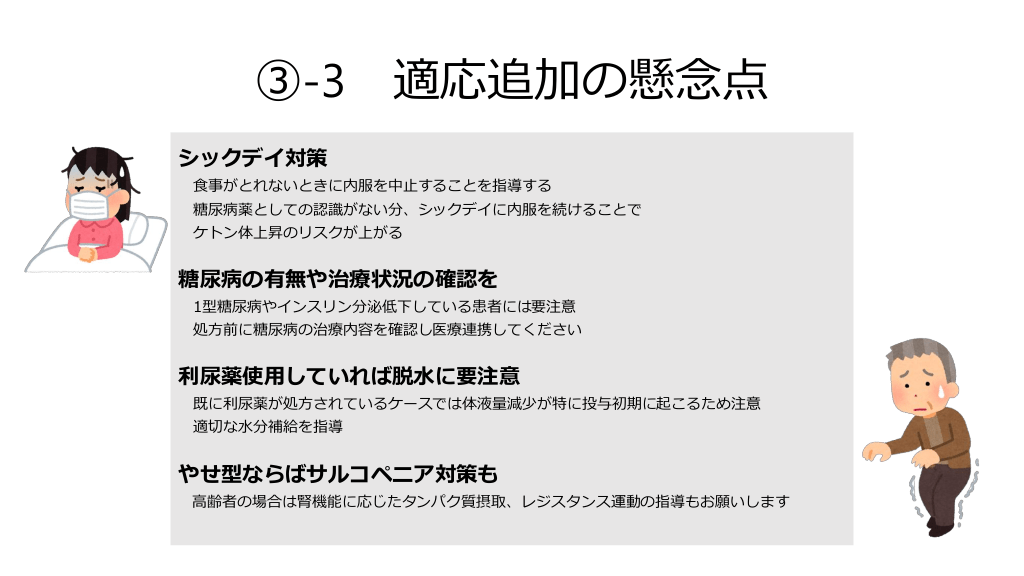 ③-3 適応追加の懸念点 シックデイ対策 食事がとれないときに内服を中止することを指導する 糖尿病薬としての認識がない分、シックデイに内服を続けることで ケトン体上昇のリスクが上がる 糖尿病の有無や治療状況の確認を 1型糖尿病やインスリン分泌低下している患者には要注意 処方前に糖尿病の治療内容を確認し医療連携してください 利尿薬使用していれば脱水に要注意 既に利尿薬が処方されているケースでは体液量減少が特に投与初期に起こるため注意 適切な水分補給を指導 やせ型ならばサルコペニア対策も 高齢者の場合は腎機能に応じたタンパク質摂取、レジスタンス運動の指導もお願いします #14.