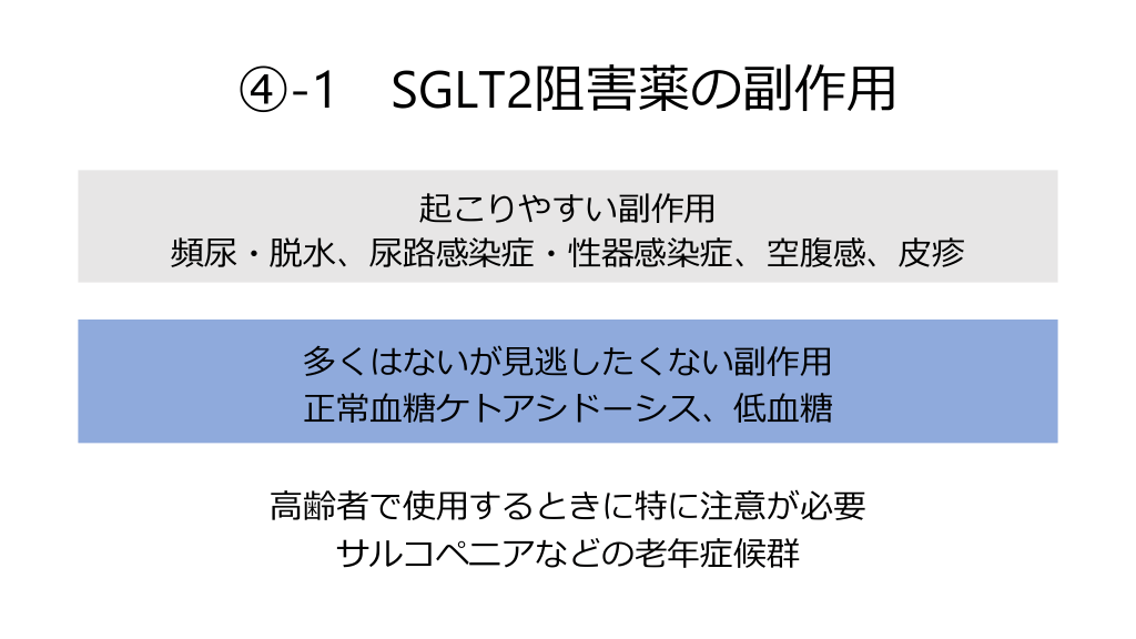 ④-1 SGLT2阻害薬の副作用 起こりやすい副作用 頻尿・脱水、尿路感染症・性器感染症、空腹感、皮疹 多くはないが見逃したくない副作用 正常血糖ケトアシドーシス、低血糖 高齢者で使用するときに特に注意が必要 サルコペニアなどの老年症候群 #15.