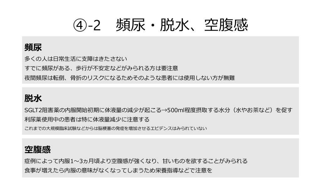 ④-2 頻尿・脱水、空腹感 頻尿 多くの人は日常生活に支障はきたさない すでに頻尿がある、歩行が不安定などがみられる方は要注意 夜間頻尿は転倒、骨折のリスクになるためそのような患者には使用しない方が無難 脱水 SGLT2阻害薬の内服開始初期に体液量の減少が起こる→500ml程度摂取する水分(水やお茶など)を促す 利尿薬使用中の患者は特に体液量減少に注意する これまでの大規模臨床試験などからは脳梗塞の発症を増加させるエビデンスはみられていない 空腹感 症例によって内服1~3ヵ月頃より空腹感が強くなり、甘いものを欲することがみられる 食事が増えたら内服の意味がなくなってしまうため栄養指導などで注意を #16.