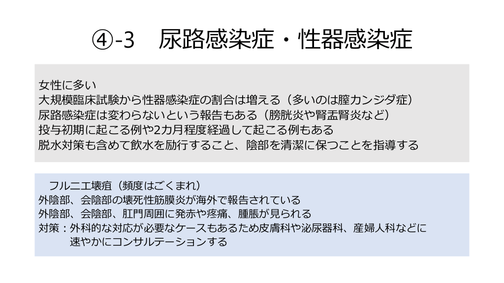 ④-3 尿路感染症・性器感染症 女性に多い 大規模臨床試験から性器感染症の割合は増える(多いのは膣カンジダ症) 尿路感染症は変わらないという報告もある(膀胱炎や腎盂腎炎など) 投与初期に起こる例や2カ月程度経過して起こる例もある 脱水対策も含めて飲水を励行すること、陰部を清潔に保つことを指導する フルニエ壊疽(頻度はごくまれ) 外陰部、会陰部の壊死性筋膜炎が海外で報告されている 外陰部、会陰部、肛門周囲に発赤や疼痛、腫脹が見られる 対策:外科的な対応が必要なケースもあるため皮膚科や泌尿器科、産婦人科などに 速やかにコンサルテーションする 正常血糖ケトアシドーシスのリスクと対策 #17.