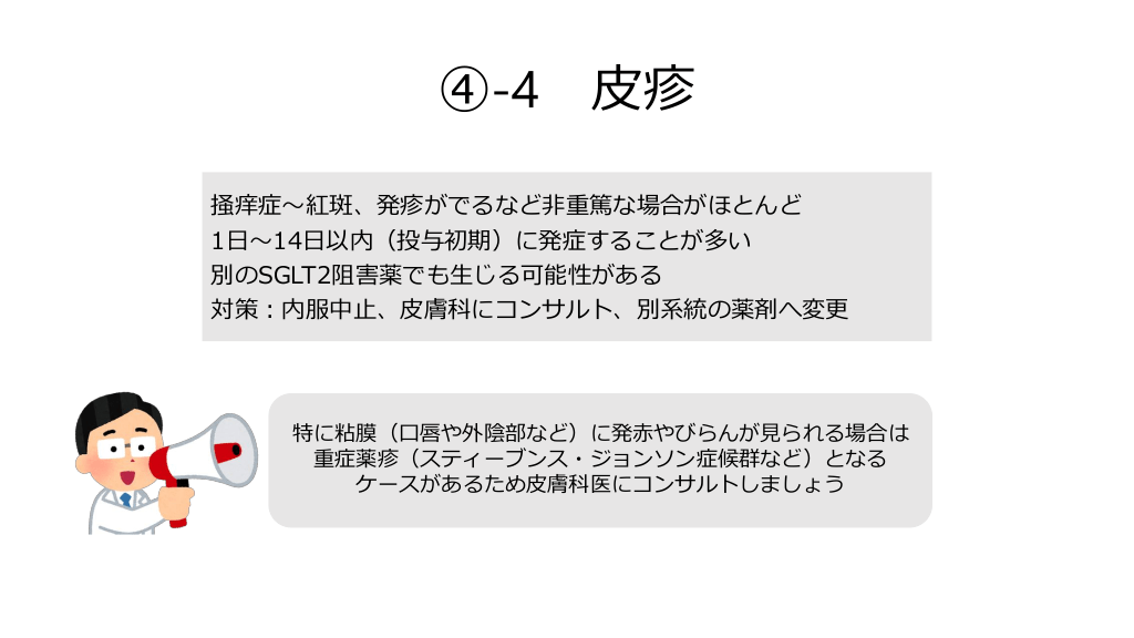 ④-4 皮疹 掻痒症~紅斑、発疹がでるなど非重篤な場合がほとんど 1日~14日以内(投与初期)に発症することが多い 別のSGLT2阻害薬でも生じる可能性がある 対策:内服中止、皮膚科にコンサルト、別系統の薬剤へ変更 特に粘膜(口唇や外陰部など)に発赤やびらんが見られる場合は 重症薬疹(スティーブンス・ジョンソン症候群など)となる ケースがあるため皮膚科医にコンサルトしましょう #18.