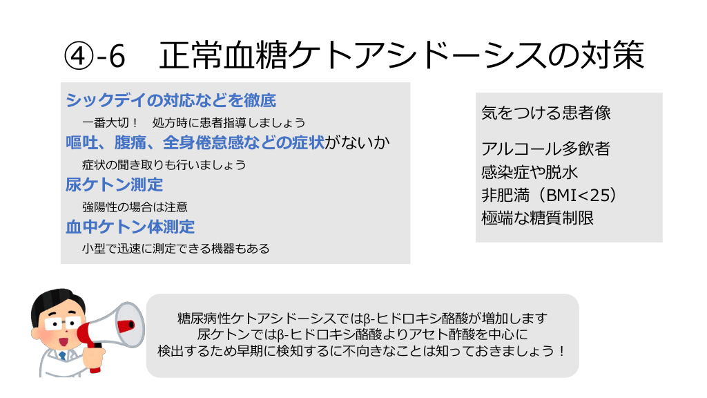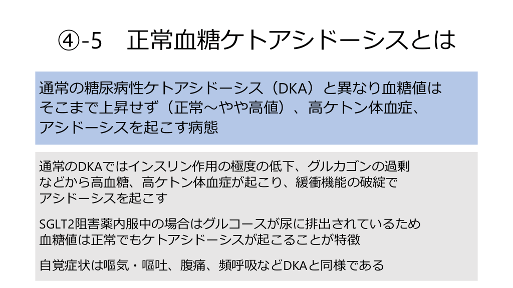 ④-5 正常血糖ケトアシドーシスとは 通常の糖尿病性ケトアシドーシス(DKA)と異なり血糖値は そこまで上昇せず(正常~やや高値)、高ケトン体血症、 アシドーシスを起こす病態 通常のDKAではインスリン作用の極度の低下、グルカゴンの過剰 などから高血糖、高ケトン体血症が起こり、緩衝機能の破綻で アシドーシスを起こす SGLT2阻害薬内服中の場合はグルコースが尿に排出されているため 血糖値は正常でもケトアシドーシスが起こることが特徴 自覚症状は嘔気・嘔吐、腹痛、頻呼吸などDKAと同様である #19.