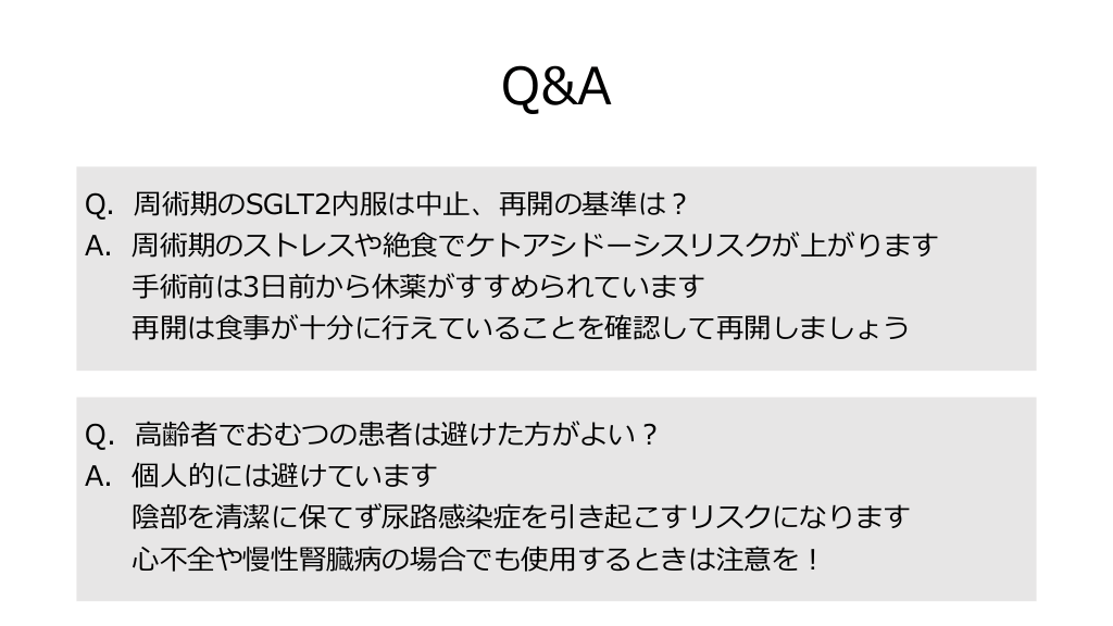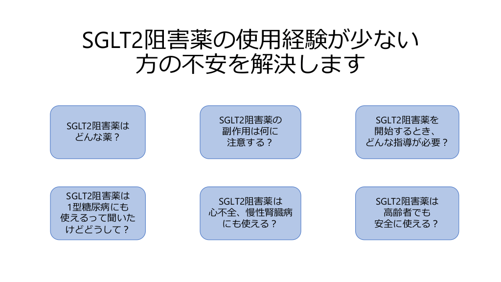 SGLT2阻害薬の使用経験が少ない 方の不安を解決します SGLT2阻害薬は どんな薬? SGLT2阻害薬の 副作用は何に 注意する? SGLT2阻害薬を 開始するとき、 どんな指導が必要? SGLT2阻害薬は 1型糖尿病にも 使えるって聞いた けどどうして? SGLT2阻害薬は 心不全、慢性腎臓病 にも使える? SGLT2阻害薬は 高齢者でも 安全に使える? #3.