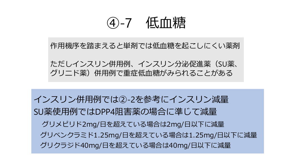 ④-7 低血糖 作用機序を踏まえると単剤では低血糖を起こしにくい薬剤 ただしインスリン併用例、インスリン分泌促進薬(SU薬、 グリニド薬)併用例で重症低血糖がみられることがある インスリン併用例では②-2を参考にインスリン減量 SU薬使用例ではDPP4阻害薬の場合に準じて減量 グリメピリド2mg/日を超えている場合は2mg/日以下に減量 グリベンクラミド1.25mg/日を超えている場合は1.25mg/日以下に減量 グリクラジド40mg/日を超えている場合は40mg/日以下に減量 高齢者におけるSGLT2阻害薬の使用とサルコペニア #21.