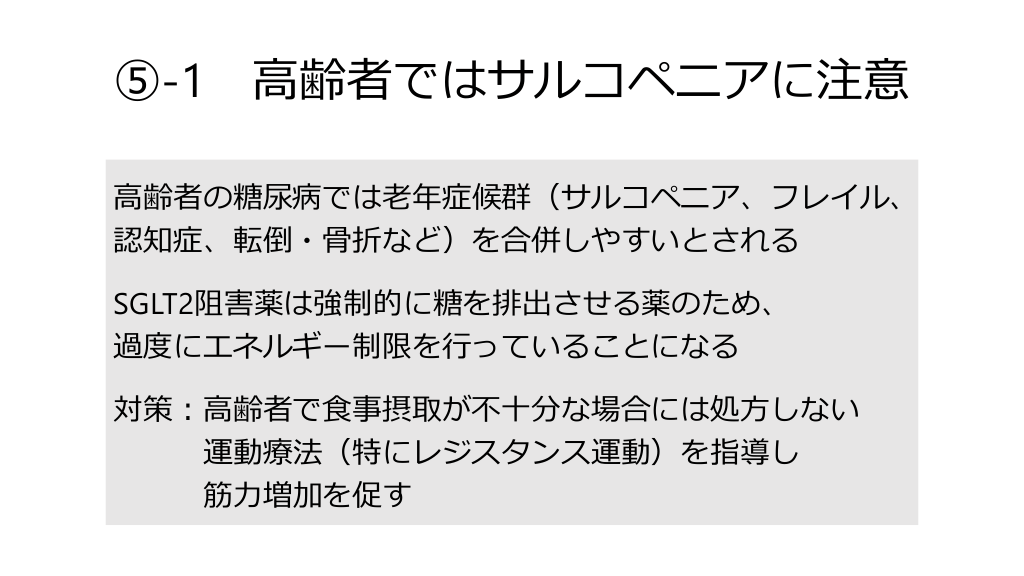 ⑤-1 高齢者ではサルコペニアに注意 高齢者の糖尿病では老年症候群(サルコペニア、フレイル、 認知症、転倒・骨折など)を合併しやすいとされる SGLT2阻害薬は強制的に糖を排出させる薬のため、 過度にエネルギー制限を行っていることになる 対策:高齢者で食事摂取が不十分な場合には処方しない 運動療法(特にレジスタンス運動)を指導し 筋力増加を促す #22.