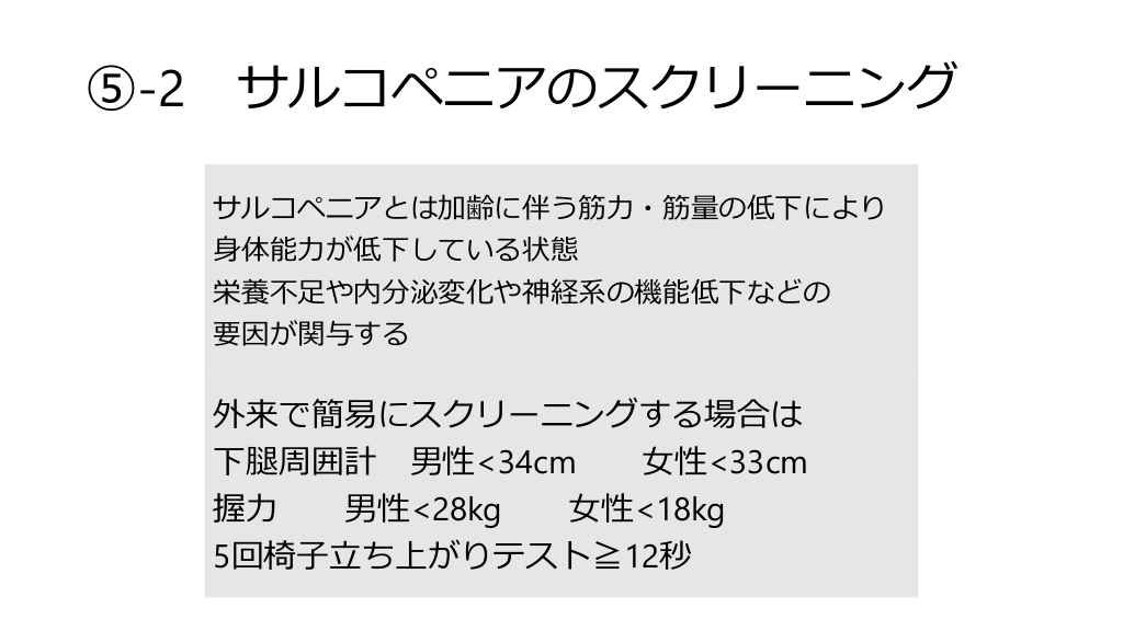 ⑤-2 サルコペニアのスクリーニング サルコペニアとは加齢に伴う筋力・筋量の低下により 身体能力が低下している状態 栄養不足や内分泌変化や神経系の機能低下などの 要因が関与する 外来で簡易にスクリーニングする場合は 下腿周囲計 男性<34cm 女性<33cm 握力 男性<28kg 女性<18kg 5回椅子立ち上がりテスト≧12秒 #23.